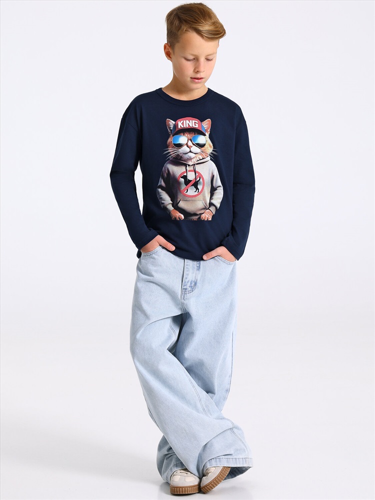 Лонгслив для мальчика выполнен из кулира – тонкого хлопкового полотна. Изделие прямого силуэта и свободного кроя, с длинными рукавами со спущенной линией плеча, вырез горловины обработан эластичной бейкой из полотна компаньона. Полочка украшена печатью. Уход: только машинная стирка (руками не стирать!) при температуре 40 градусов, без предварительного замачивания. Изделия с печатью перед стиркой необходимо вывернуть на изнаночную сторону.