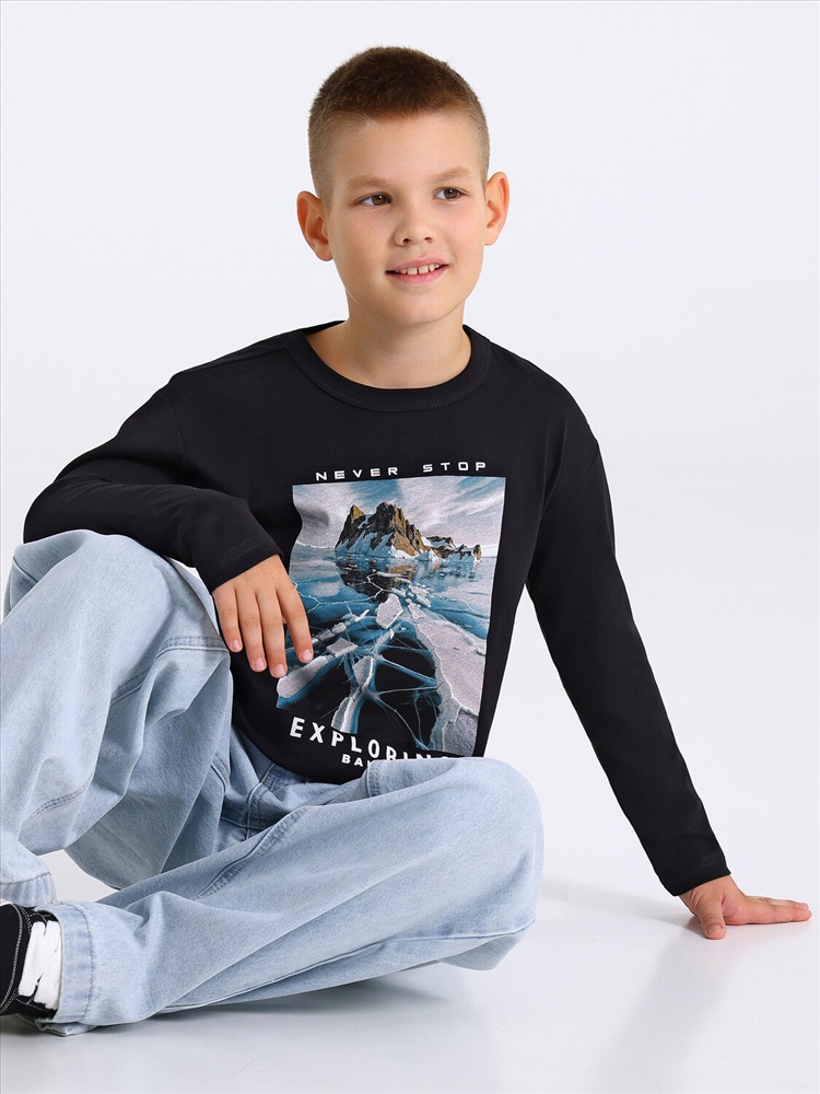 Лонгслив для мальчика выполнен из кулира – тонкого хлопкового полотна. Изделие прямого силуэта и свободного кроя, с длинными рукавами со спущенной линией плеча, вырез горловины обработан эластичной бейкой из полотна компаньона. Полочка украшена печатью. Уход: только машинная стирка (руками не стирать!) при температуре 40 градусов, без предварительного замачивания. Изделия с печатью перед стиркой необходимо вывернуть на изнаночную сторону.