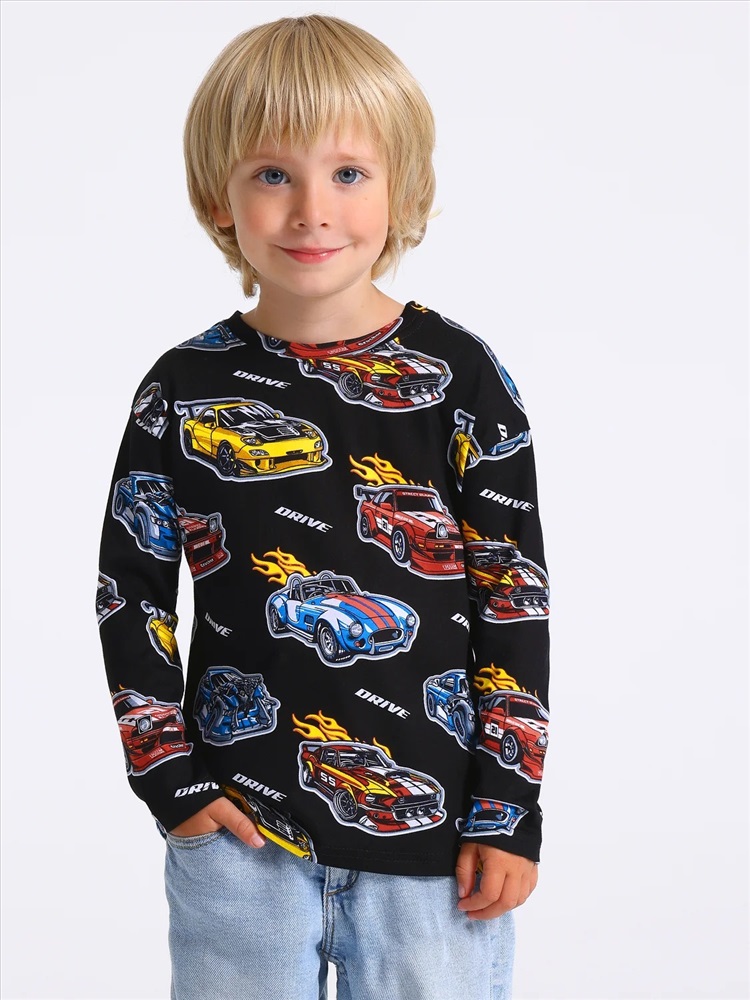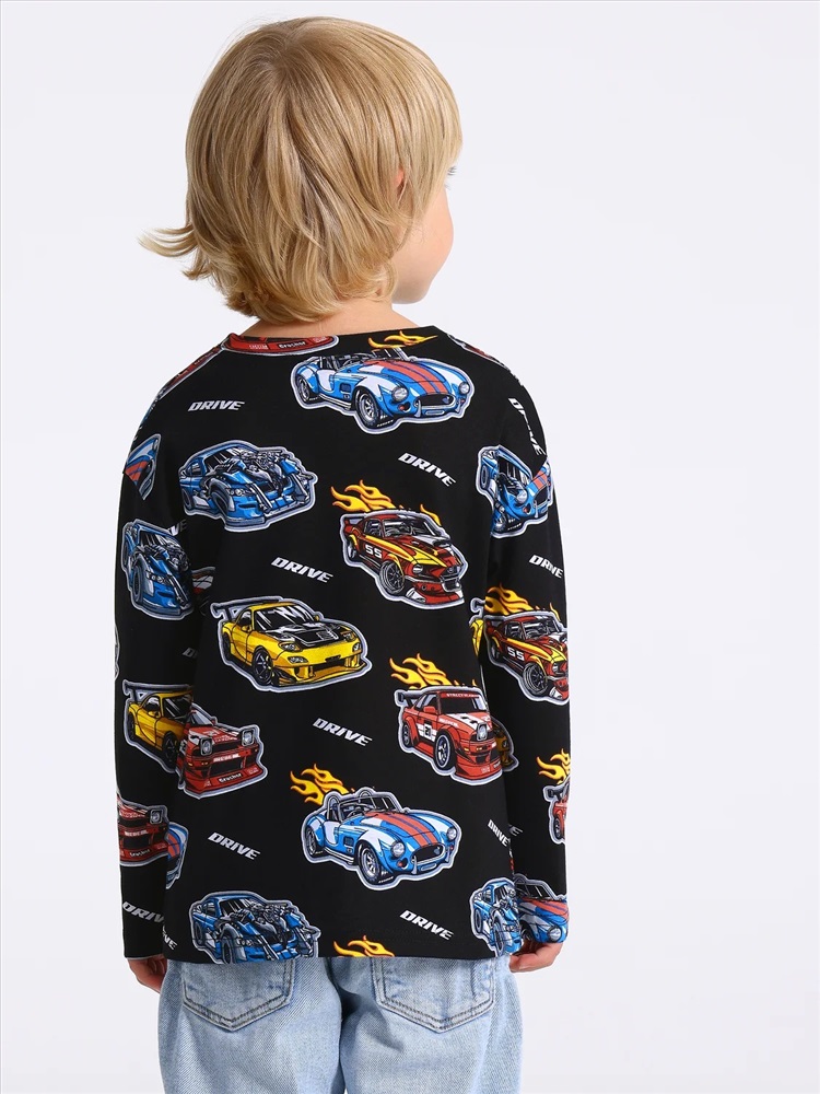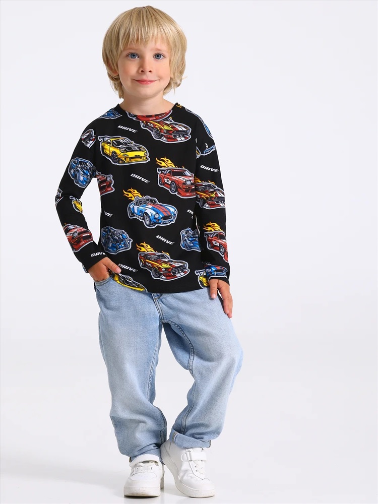 Лонгслив для мальчика выполнен из кулира – легкого хлопкового набивного полотна. Изделие прямого силуэта с длинными рукавами со спущенной линией плеча. Уход: только машинная стирка (руками не стирать!) при температуре 40 градусов, без предварительного замачивания.