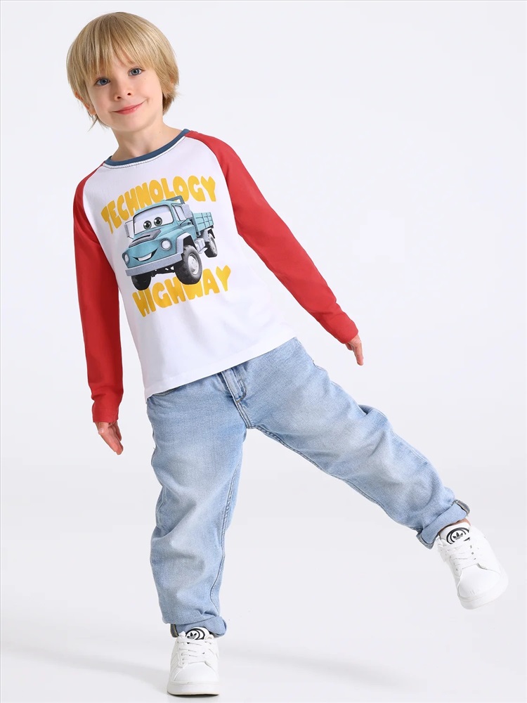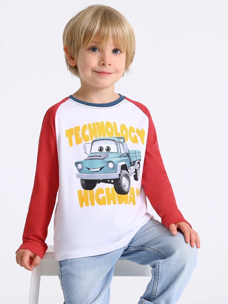 Лонгслив для мальчика выполнен из кулира – тонкого хлопкового полотна. Изделие прямого силуэта с длинными рукавами-реглан. Полочка украшена печатью. Уход: только машинная стирка (руками не стирать!) при температуре 40 градусов, без предварительного замачивания. Изделия с печатью перед стиркой необходимо вывернуть на изнаночную сторону.