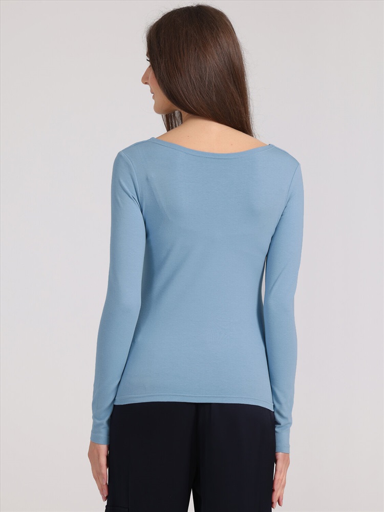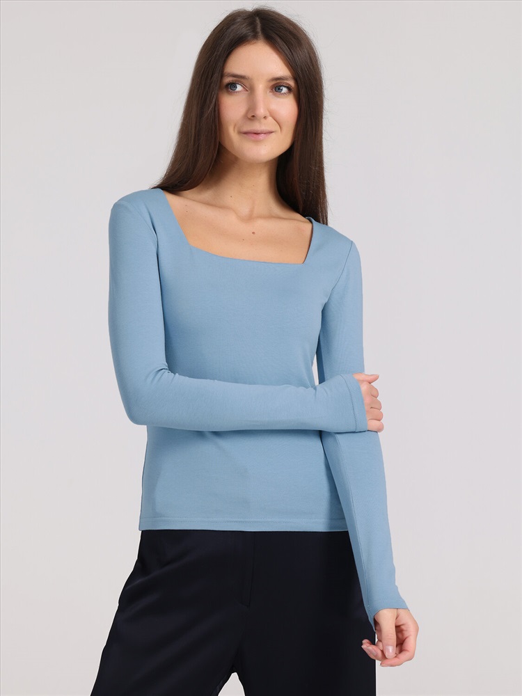 Стильный лонгслив выполнен из мягкого хлопкового полотна с лайкрой. Изделие полуприлегающего силуэта с углубленным вырезом каре и длинными рукавами. Отличный выбор на каждый день! Уход: только машинная стирка (руками не стирать!) при температуре 40 градусов, без предварительного замачивания.