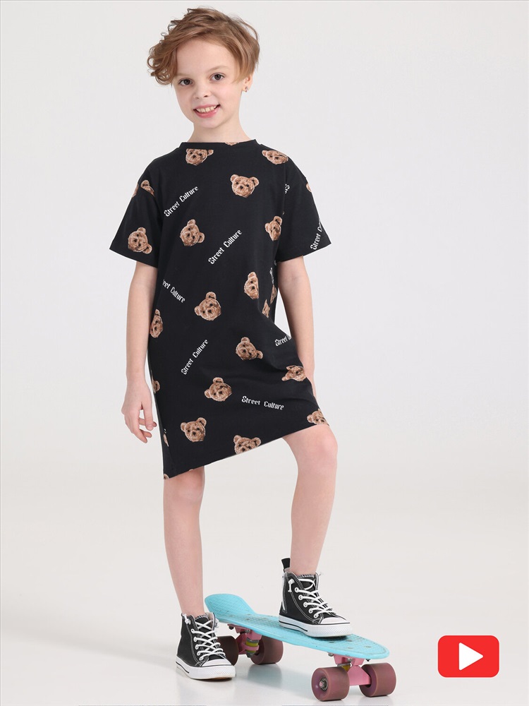 Платье Oversize из кулира - легкого хлопкового полотна. Изделие с короткими рукавами со спущенным плечом, украшено стильной набивкой. Отличный выбор для летнего жаркого дня! Уход: только машинная стирка (руками не стирать!) при температуре 40 градусов, без предварительного замачивания.