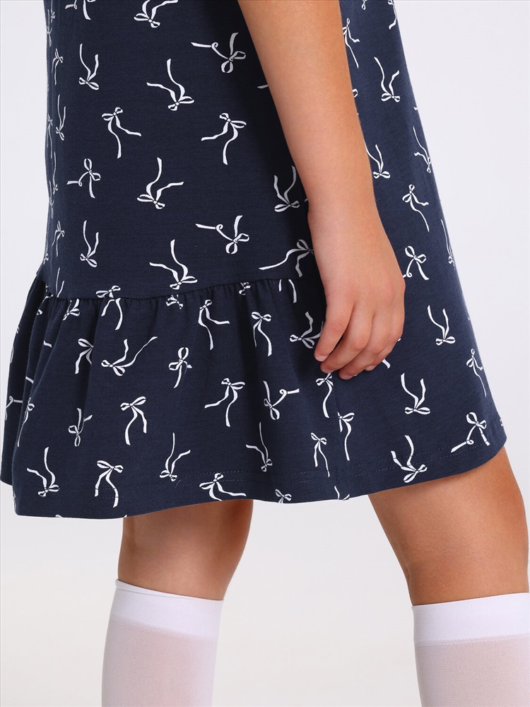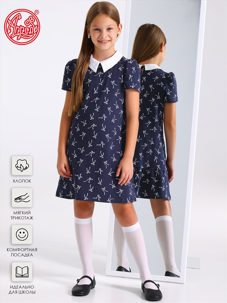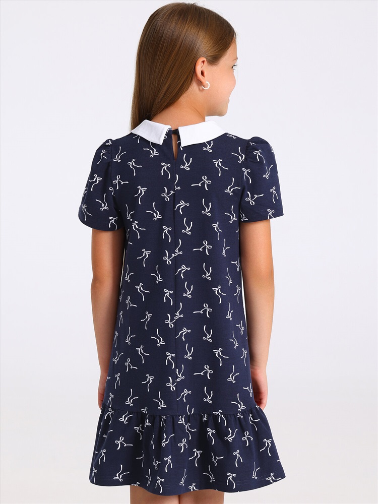 Платье для девочки из кулира - тонкого хлопкового полотна с лайкрой. Изделие трапециевидного силуэта, с коротким рукавом со сборкой по окату и отложным воротником. По спинке застежка на пуговицу, по низу оборка.