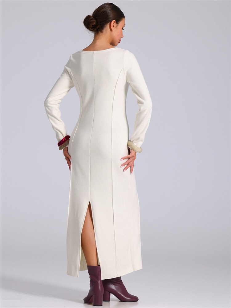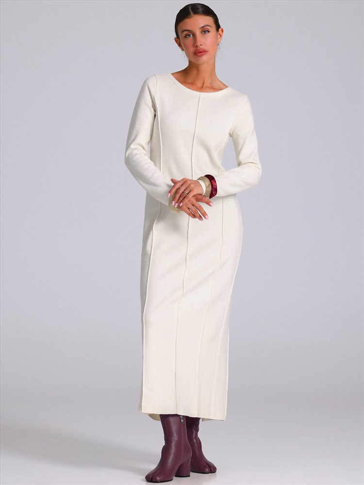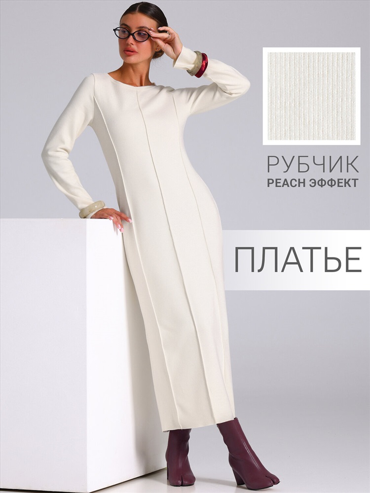 Женское платье выполнено из теплого вязаного полотна в рубчик. Изделие полуприлегающего силуэта с длинными рукавами, с необработанным низом изделия и рукавов. На полочке рельефы из проймы и отстрочка по центру, на спинке средний шов и рельефы из проймы. Уход: только бережная машинная стирка до 40C (руками не стирать), изделие вывернуть наизнанку, без предварительного замачивания. Барабанная сушка запрещена.