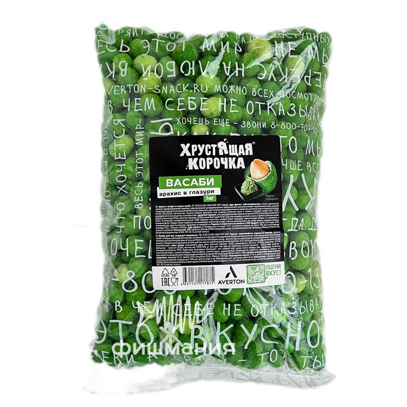 Состав: Ядра арахиса не бланшированные, патока, карамельная, изолят горохового белка, крахмал пшеничный, соль пищевая, восстанавливающийся рисовый порошок, мальтодекстрин, пшеничная мука, сахар, сушёная зелёная паприка, смесь специй (васаби, хрен, горчица, кориандр), дрожжи, антиокислитель (E621, E635), регуляторы кислотности (E330), краситель (E102, E133), стабилизаторы (E466, E415), ароматизатор (васаби).