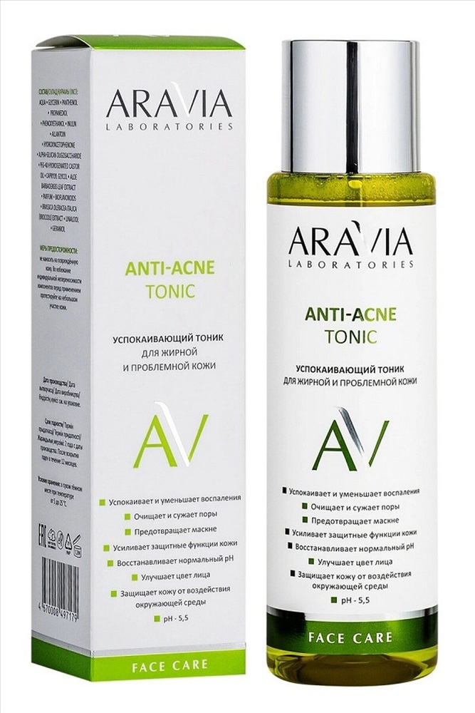 Тоник предназначен для ухода за жирной и проблемной кожей, склонной к акне. Способствует заживлению и восстановлению кожи, снимает раздражения, покраснения, успокаивает и освежает. Очищает и сужает поры, нормализует выработку себума. Выравнивает цвет лица, увлажняет и смягчает кожу. Восстанавливает нормальный уровень pH. Укрепляет и усиливает защитные функции кожи, повышает сопротивляемость внешним воздействиям и стрессам. Защищает кожу от токсинов. рН — 5,5. Назначение: тонизирование, восстановление уровня рН, борьба с воспалениями и черными точками. Рекомендации по использованию: ежедневное использование 1-2 раза в день — для домашнего ухода. Биоактивный состав: биолин, биофлавоноиды, пантенол, аллантоин, экстракт алоэ, экстракт брокколи. Биолин — мощный натуральный растительный пребиотик. Регулирует естественное соотношение микрофлоры на поверхности кожи, восстанавливает нормальный уровень рН. Устраняет покраснения и воспаления. Укрепляет и усиливает защитные функции кожи. Снижает проницаемость кожного покрова для болезнетворных и вредных организмов. Биофлавоноиды обладают выраженным антиоксидантным действием. Защищают от вредного воздействия свободных радикалов. Замедляют процессы старения, омолаживают кожу и повышают ее тонус. Интенсивно увлажняют кожу. Способствуют регенерации тканей и ускоряют процессы заживления. Обладают противовоспалительным и антисептическим действием. Пантенол обладает увлажняющим, заживляющим, смягчающим и разглаживающим действием. Делает кожу более эластичной, оказывает успокаивающее действие. Аллантоин обладает кератолитическим, успокаивающим, заживляющим и противовоспалительным действием. Нейтрализует вредное воздействие свободных радикалов. Борется с бактериями. Экстракт алоэ увлажняет, успокаивает, омолаживает. Обладает антибактериальными и ранозаживляющими свойствами. Экстракт брокколи оказывает отбеливающее, антиоксидантное, противовоспалительное, вяжущее и тонизирующее действие. Способ применения: Нанесите тоник при помощи ватного диска на чистую кожу лица и шеи. Рекомендуется использовать 1-2 раза в день. Во время применения рекомендуется использовать средства с SPF. Меры предосторожности: не наносите на поврежденную кожу и избегайте попадания в глаза. При попадании в глаза тщательно промойте водой. Перед применением тестируйте на небольшом участке кожи. Состав: Aqua, Glycerin, Panthenol, Propanediol, Phenoxyethanol, Inulin, Allantoin, Hydroxyacetophenone, Alpha-Glucan Oligosaccharide, PEG-40 Hydrogenated Castor Oil, Caprylyl Glycol, Aloe Barbadensis Leaf Extract, Parfum, Bioflavonoids, Brassica Oleracea Italica (Broccoli) Extract, Linalool, Geraniol. Обращаем Ваше внимание на то, что состав средства может измениться. Актуальная информация указана на упаковке средств. Текстура и цвет средства может отличаться.