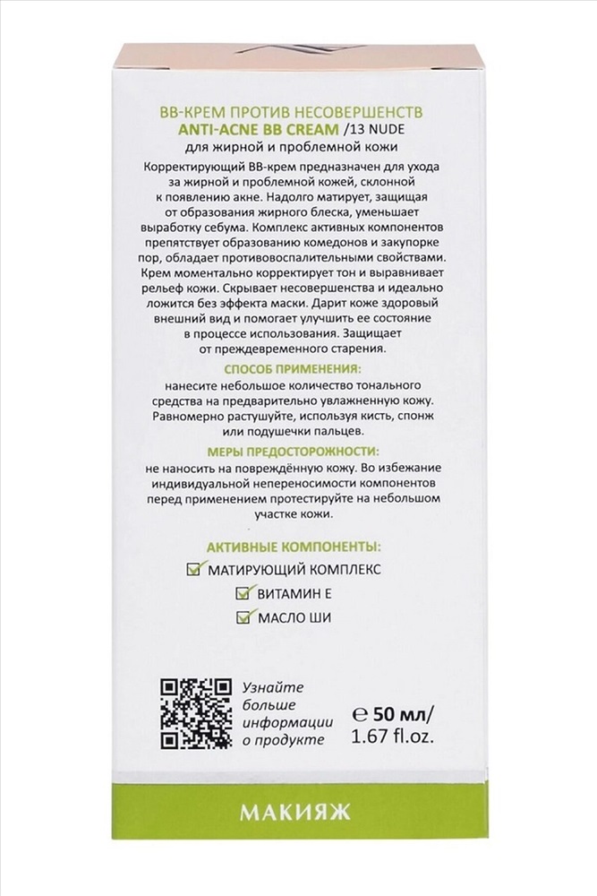 ID товара: 1135589 Сезон: Демисезон Объем: 50 мл Назначение: Лицо Производитель: Aravia Laboratories Температурный режим: Хранение и транспортировка при температуре не ниже 0 °C Срок годности (мес): 36 Количество в упаковке: 1 шт. Страна бренда: Россия Страна производства: Россия Корректирующий BB-крем предназначен для ухода за жирной и проблемной кожей, склонной к появлению акне. Надолго матирует, защищая от образования жирного блеска, уменьшает выработку себума. Комплекс активных компонентов препятствует образованию комедонов и закупорке пор, обладает противовоспалительными свойствами. Крем моментально корректирует тон и выравнивает рельеф кожи. Скрывает несовершенства и идеально ложится без эффекта маски. Дарит коже здоровый внешний вид и помогает улучшить состояние в процессе использования. Защищает от преждевременного старения. Номер тона: 13 nude / светло бежевый Назначение: коррекция тона кожи. Рекомендации для использования: ежедневное использование в домашнем уходе. Биоактивный состав: матирующий комплекс, витамин Е, масло ши. Матирующий комплекс моментально и надолго матирует кожу, защищает от образования жирного блеска, уменьшает выработку себума. Витамин Е способствует обновлению клеток, замедляет появление видимых признаков старения кожи, в том числе преждевременное образование морщин. Масло ши обладает выраженными антиоксидантным действием, стимулирует замедлившиеся процессы метаболизма увядающей кожи и регенерацию клеток. Укрепляет ослабленную кожу, делает ее более плотной и эластичной. Регулярное использование масла карите улучшает цвет лица, уплотняет текстуру кожи, повышает тонус и упругость, способствует уменьшению глубины морщинок. Способ применения: Нанесите небольшое количество тонального средства на предварительно увлажненную кожу. Равномерно растушуйте, используя кисть, спонж или подушечки пальцев. Меры предосторожности: не наносите на поврежденную кожу и избегайте попадания в глаза. При попадании в глаза тщательно промойте водой. Перед применением тестируйте на небольшом участке кожи. Состав: Aqua, Ethylhexyl Methoxycinnamate, C12—C15 Alkyl Benzoate, Glycerin, Caprylic/Capric Triglyceride, Butylene Glycol, Cetearyl Olivate, Ceteareth-20, Butyrospermum Parkii (Shea Butter), Dimethicone, Sodium Potassium Aluminum Silicate, Sorbitan Olivate, Ammonium Acryloyldimethyltaurate/VP Copolymer, Ethylhexylglycerin, Cyclopentasiloxane, Phenoxyethanol, Tocopheryl Acetate, Silica, Parfum, Enantia Chlorantha Bark Extract, Disodium EDTA, Sodium Lauroyl Glutamate, Lysine, Hexyl Cinnamal, Benzyl Benzoate, Benzyl Salicylate, Magnesium Chloride, Hydroxycitronellal, Citronellol, Oleanolic Acid. May Contain (+/-): CI 77891, CI 77492, CI 77491, CI 77499, Aluminium Hydroxide. Обращаем Ваше внимание на то, что состав средства может измениться. Актуальная информация указана на упаковке средств. Текстура и цвет средства может отличаться. Комментарии к товару