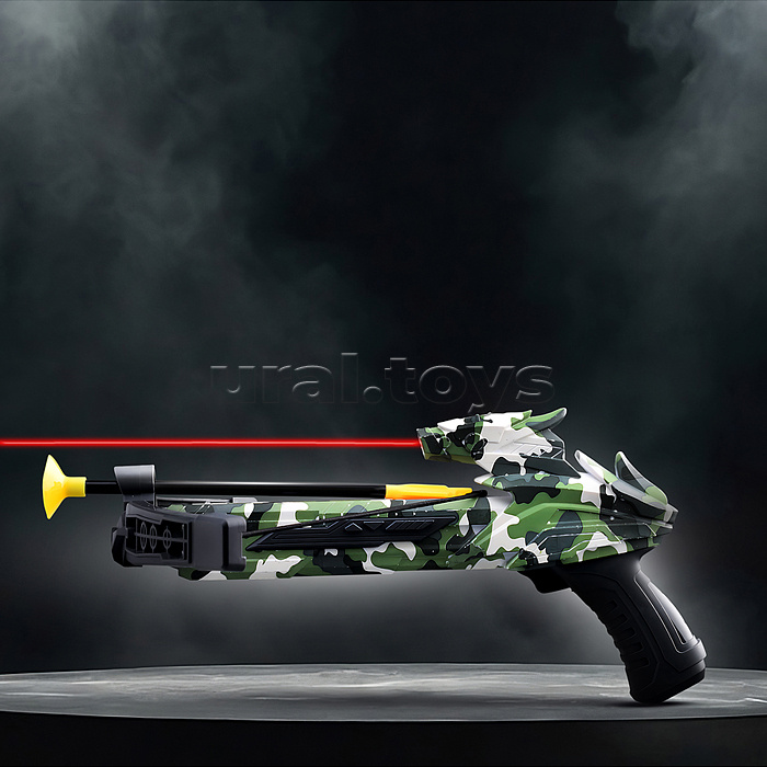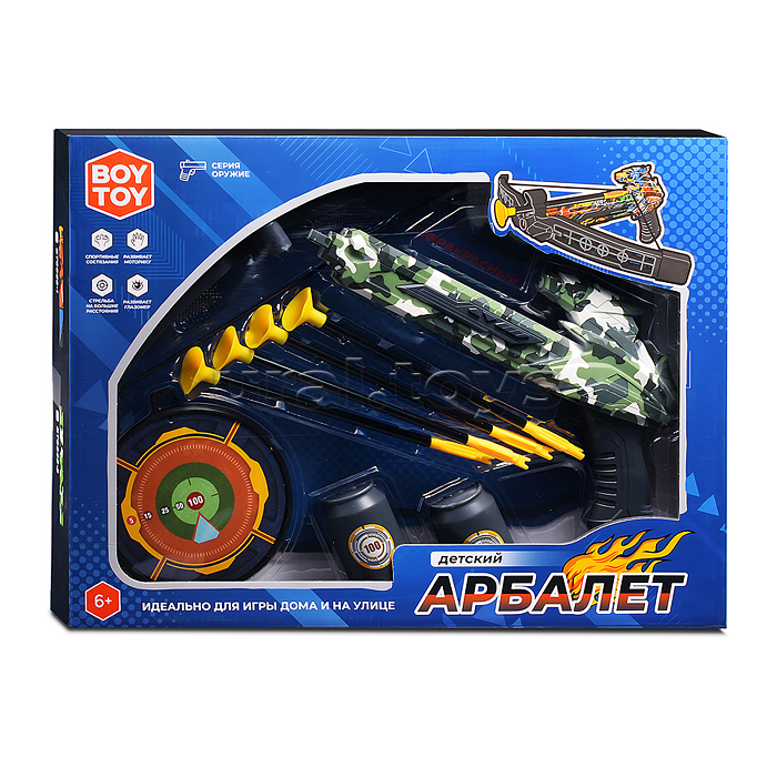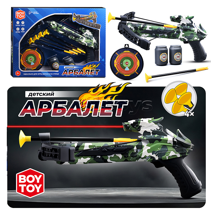• В наборе: - арбалет с лазерным целеуказателем (32.5х28х16 см.) - 4 стрелы с присосками (20.5 см.) - картонная мишень (13х13 см.) - 2 банки (4.5х4.5х6.5 см.) • Лазер работает от 3-х батареек "AG13" (входят в комплект для демонстрации) • Материал: пластик. • Соответствует требованиям безопасности продукции. • Для детей от 6 лет.