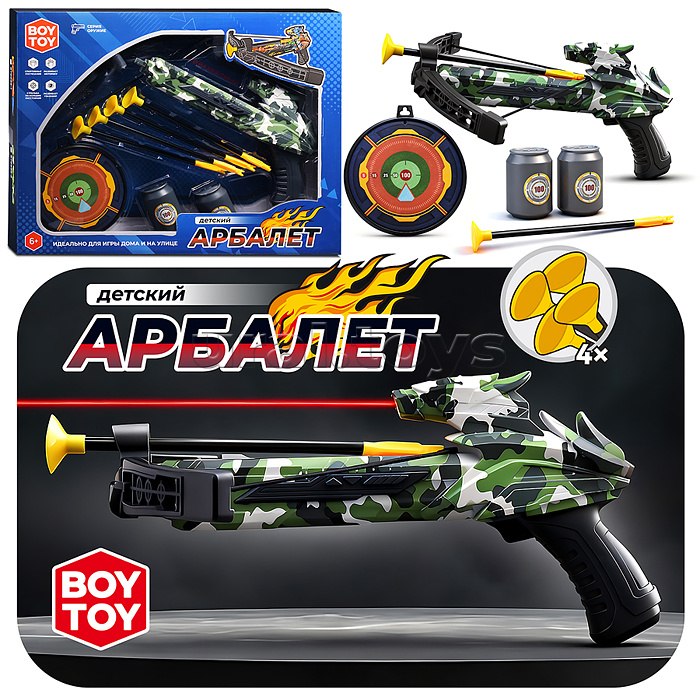 Код: 483697 Штрихкод: 4630432203449 Страна производитель: Китай Размеры упаковки: 42 x 6 x 32 см Количество в коробке: 24 • В наборе: - арбалет с лазерным целеуказателем (32.5х28х16 см.) - 4 стрелы с присосками (20.5 см.) - картонная мишень (13х13 см.) - 2 банки (4.5х4.5х6.5 см.) • Лазер работает от 3-х батареек "AG10" (входят в комплект для демонстрации) • Материал: пластик. • Соответствует требованиям безопасности продукции. • Для детей от 6 лет. Комментарии к товару