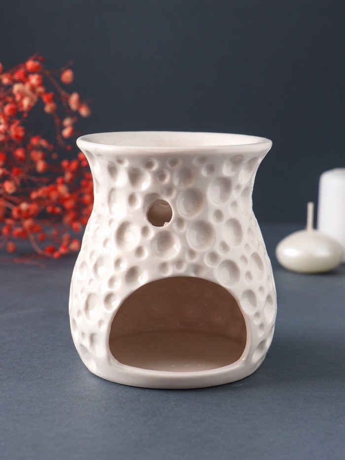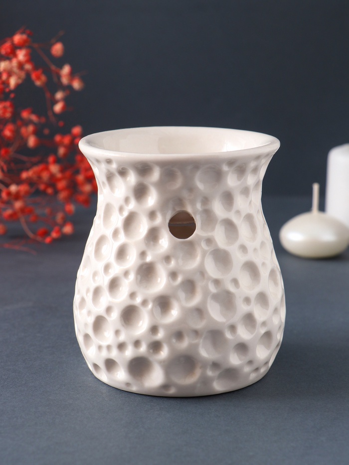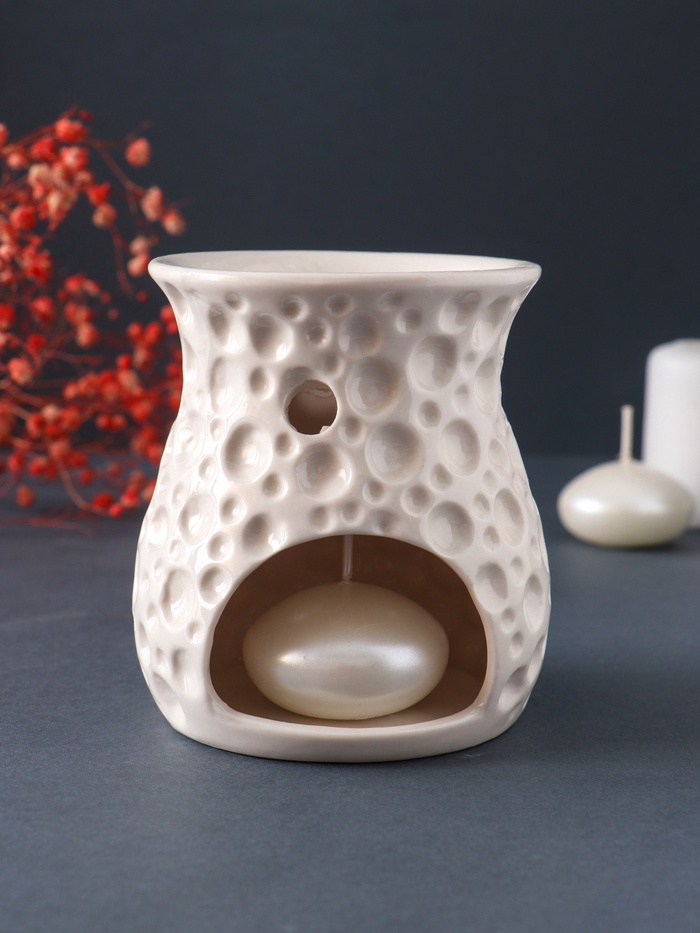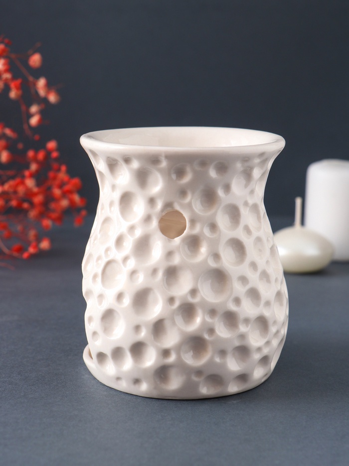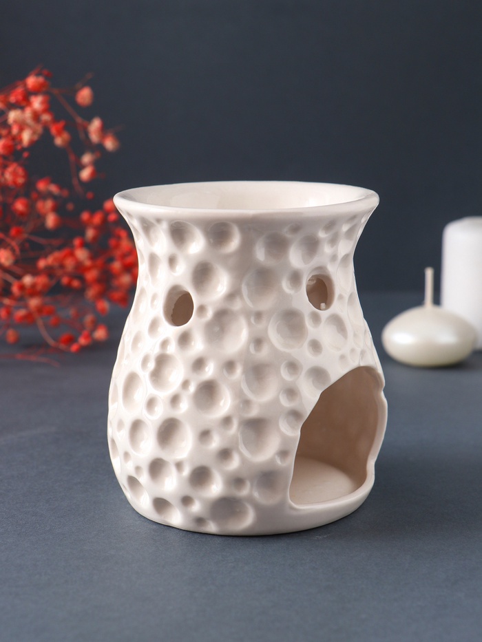 Как это работает Тепло от свечи мягко нагревает воду с добавленными эфирными маслами, постепенно испаряя их. Этот метод ароматерапии безопасен и эффективен: он помогает очистить воздух, создать нужное настроение или поддержать дыхание в сезон простуд. Лампу легко мыть, а её нейтральный цвет со временем не выгорает. ДополнительноДля производства аромаламп используют более дешёвую глину, в которой допустимы инородные вкрапления - в следствии чего на изделии могут быть чёрные точки. При обжиге изделия могут образовываться микротрещины, что тоже не является браком. Комментарии к товару