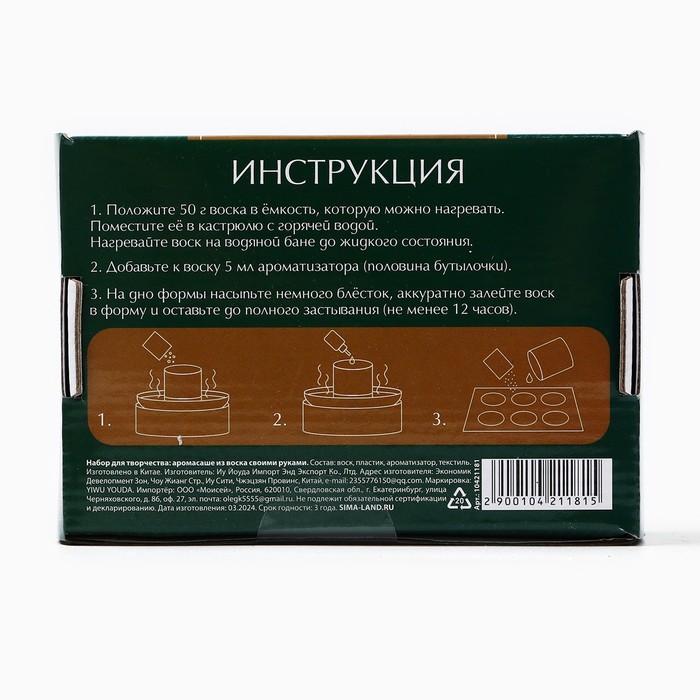Положите 50 г воска в ёмкость, которую можно нагревать.Поместить её в кастрюлю с горячей водой.Нагревайте воск на водяной бане до жидкого состояния.Добавьте к воску 5 мл ароматизатора (половина бутылька).На дно формы насыпьте немного блесток, аккуратно залейте воск форму и оставьте до полного застывания не менее 12 часов.Восковое саше - это вечный аромакамень, который будет радовать Вас на протяжении полутора-двух месяцев, а после Вы можете нанести немного парфюма или несколько капель масла на любую сторону, и аромасаше будет продолжать радовать Вас ароматом.
