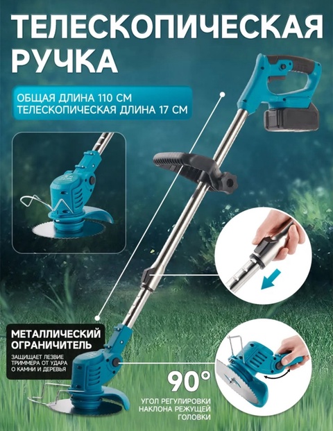 Триммер садовый аккумуляторный; зарядное устройство; шестигранник для сборки; защитный кожух; два аккумулятора; пластиковые лезвия - 5шт.; металлические лезвия - 2шт.; пильный диск - 1шт.; инструкция - 1 шт; колесная база.