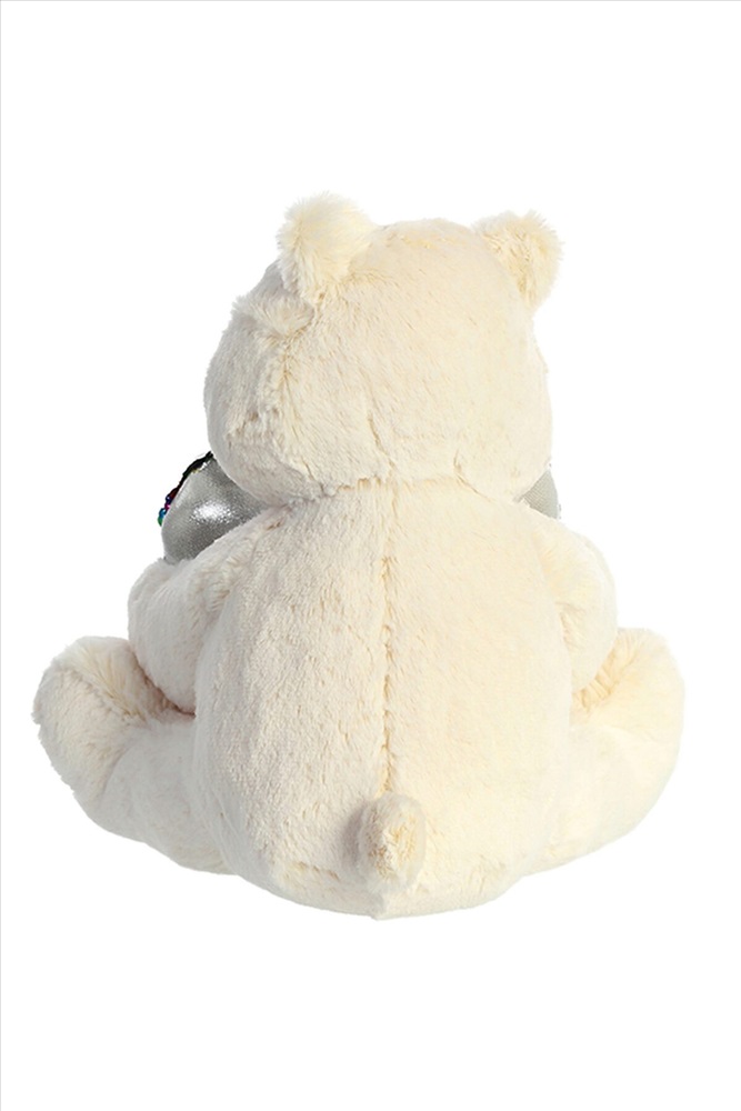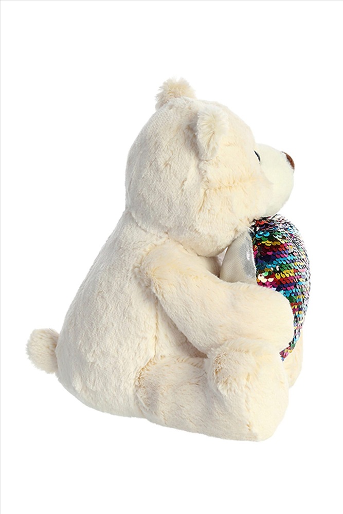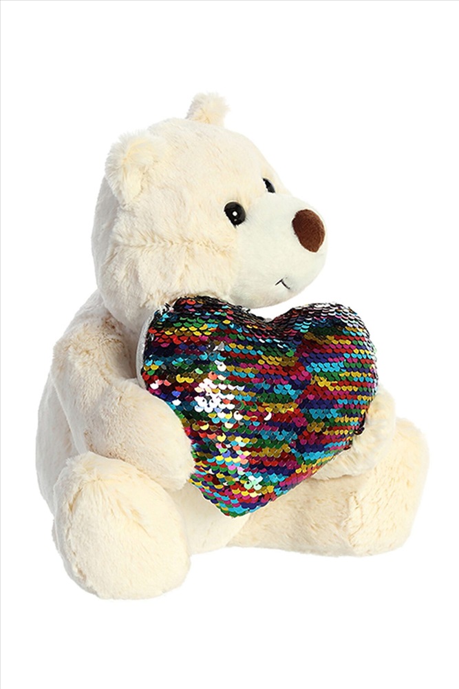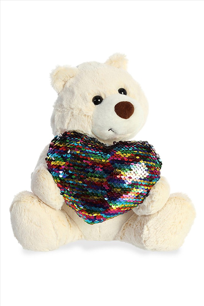 Плюшевый медведь кремового цвета с белой мордочкой, круглыми карими глазами и коричневым мягким носом. Игрушка в сидячей позе, держит в лапах большое сердечко в блестящих пайетках. Если провести рукой против направления пайеток, они изменяют цвет. Размер игрушки 30 см.