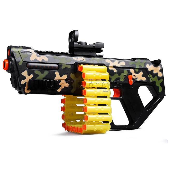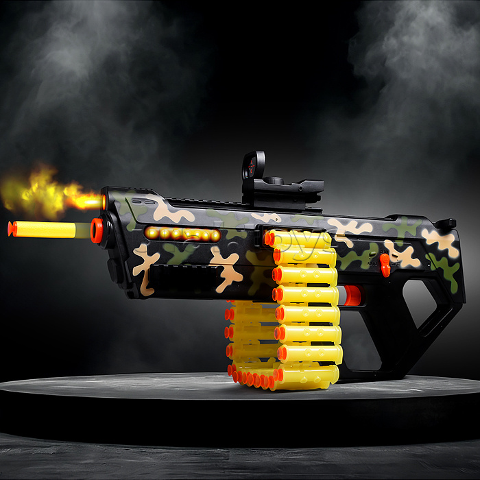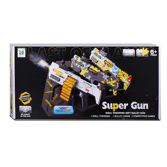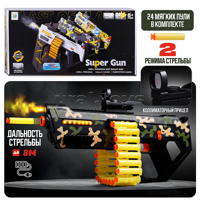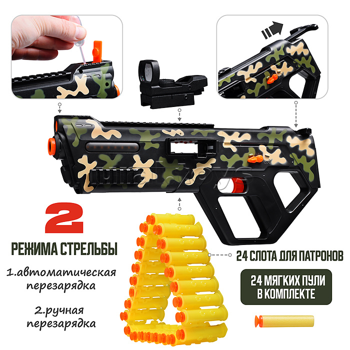 • Размеры игрушки: 43х6х19 см. • Пневматический механизм. • 2 режима стрельбы: автоматический и ручной. • Пар из сопла (при наличии воды в резервуаре) • Материал: пластик. • В комплекте: - аккумулятор "7.4V 500 mAh" - USB-шнур для подзарядки. - 24 мягкие пули с присосками. - пулемётная лента. • Соответствует требованиям безопасности продукции. • Для детей от 6 лет.