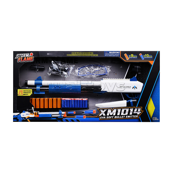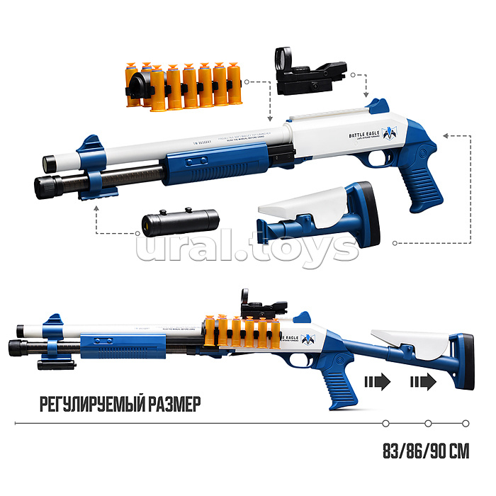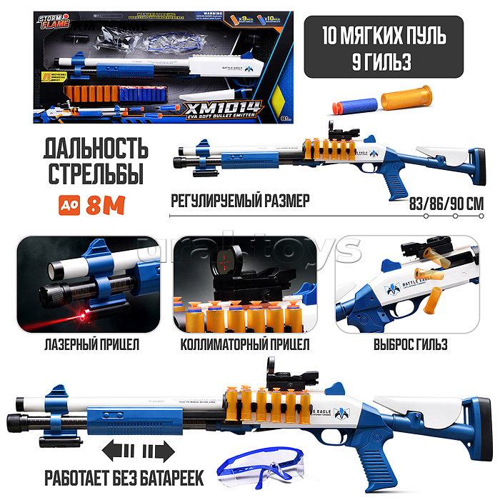 • Размеры игрушки: 83х4х20 см. • Пневматический механизм стрельбы. • Ручной взвод. • При перезарядке вылетает гильза. • В комплекте: - 10 мягких пуль с присосками. - 9 гильз. - защитные очки. - лазерный целеуказатель - работает от 2-х батареек "LR1130" (входят в комплект для демонстрации). • Размеры пуль: 45х12 мм. • Размеры гильз: 50х16 мм. • Съёмный приклад. • Материал: пластик. • Соответствует требованиям безопасности продукции. • Для детей от 8 лет.