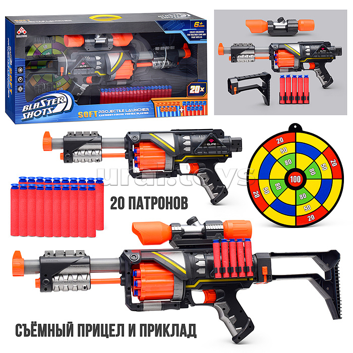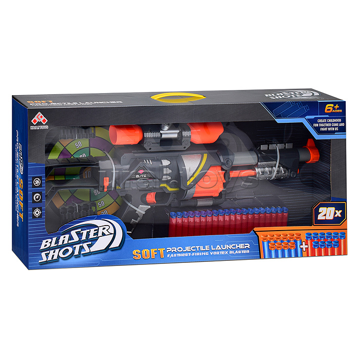 Код: 492632 Штрихкод: 6904111977913 Страна производитель: Китай Размеры упаковки: 68 x 11 x 30 см Количество в коробке: 8 • Размеры игрушки: 64х9х25 см. • Пневматический механизм стрельбы. • Ручная перезарядка. • Материал: пластик. • В комплекте: - 20 мягких пуль с присосками (7.5 см.) - картонная мишень (18х18 см.) • Соответствует требованиям безопасности продукции. • Для детей от 6 лет. Комментарии к товару