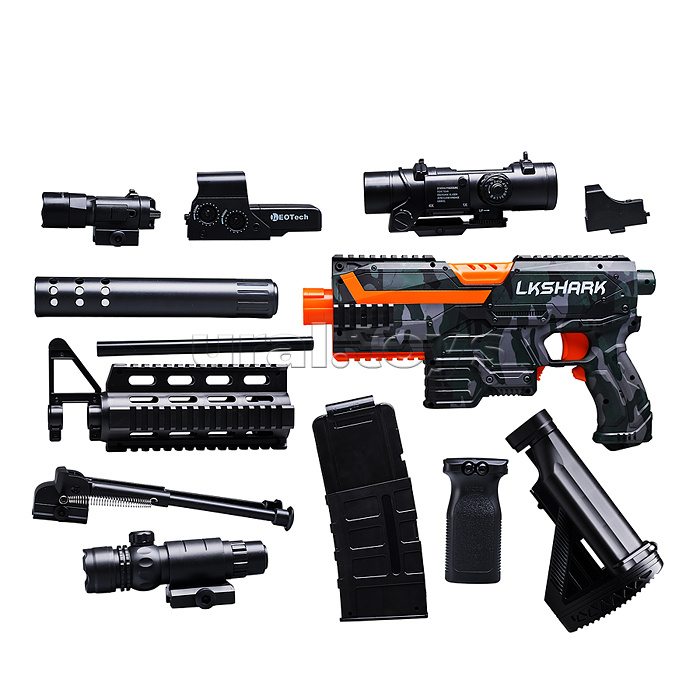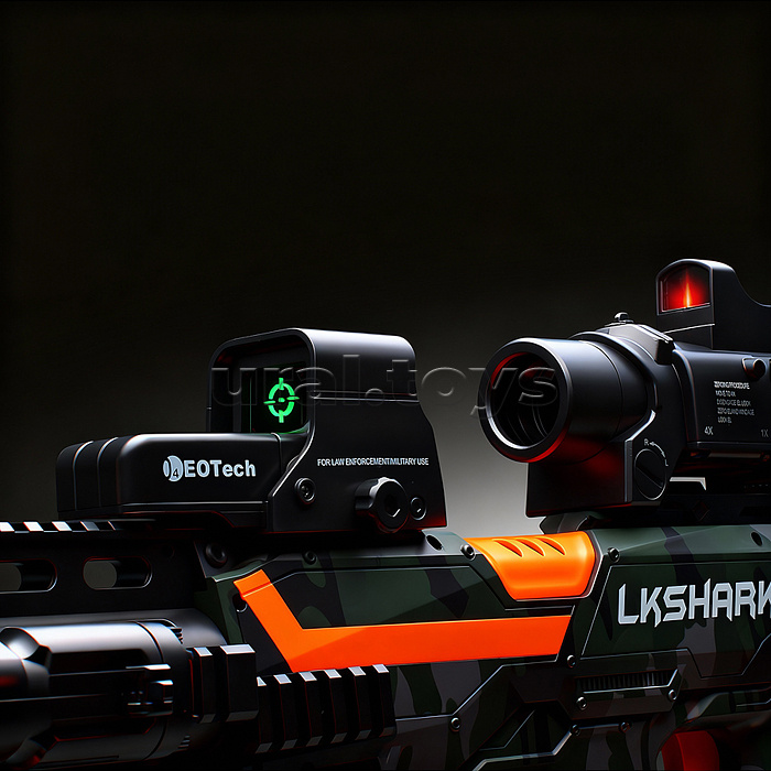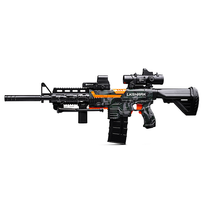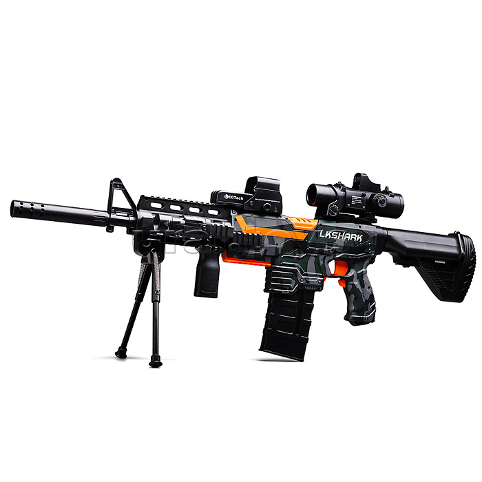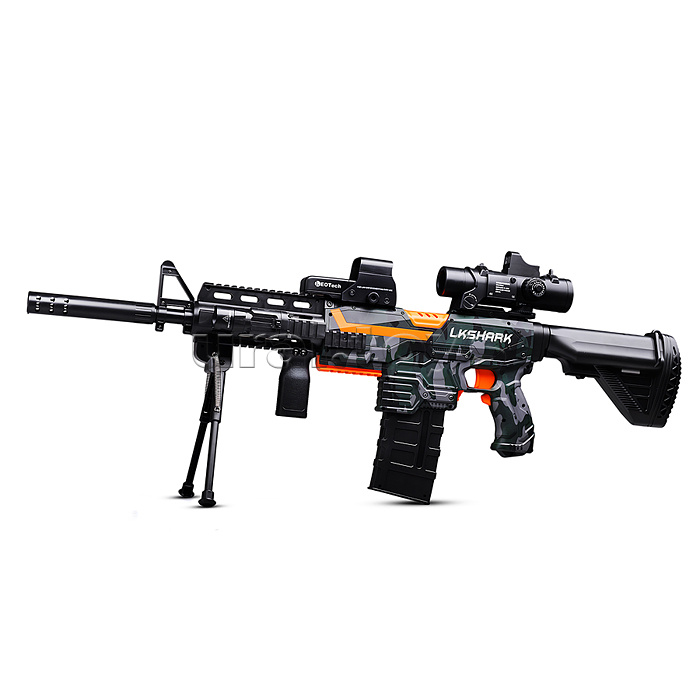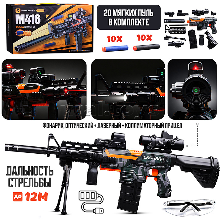 • Размеры игрушки: 89х14х37 см. • Работает от аккумулятора "1200 mAh 3.7V" (входит в комплект) • При включении внутри работает моторчик. • При нажатии на спусковой крючок вылетает пуля, после каждого нажатия. • Съёмный оптический прицел (увеличение 4Х) • Съёмный коллиматорный прицел с подсветкой. • Съёмный фонарик. • Съёмный инфракрасный целеуказатель. • Прицел работает от 2-х батареек "AG13" (входят в комплект) • Фонарик работает от 3-х батареек "AG13" (входят в комплект) • Целеуказатель работает от 2-х батареек "LR1130" (входят в комплект) • Материал: пластик. • В комплекте: - 10 мягких пуль с присосками (7.5 см.) - 10 мягких пуль с резиновым наконечником (7.5 см.) - картонная мишень (23х23 см.) - защитные очки. - USB-шнур для подзарядки аккумулятора. • Соответствует требованиям безопасности продукции. • Для детей от 6 лет.