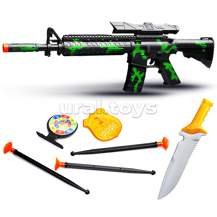 Код: 493541 Штрихкод: 6933118065422 Страна производитель: Китай Размеры упаковки: 17 x 47 x 5 см Количество в коробке: 102 • Размеры игрушки: 46х3х14.5 см. • Пружинный механизм стрельбы. • В комплекте: - 3 пластиковые пули с присосками. - мишень (5х1.5х6 см.) - нож (6х2х25 см.) - полицейский жетон. • Материал: пластик. • Соответствует требованиям безопасности и стандартам качества продукции. • Для детей от 3-х лет. Комментарии к товару