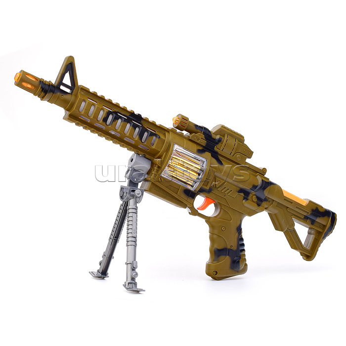 Код: 382489 Страна производитель: Китай Размеры упаковки: 55 x 21 x 5 см Количество в коробке: 36 Разнообразные звуки выстрелов и крик «Fire!». Разноцветная подсветка по всему корпусу. Вращающийся барабан с патронами. Работает от 3-х батареек «АА» (не входят в комплект). Размер: 45 х 22 х 5 см. Материал: пластик. Для детей от 3-х лет. Соответствует требованиям безопасности продукции. Комментарии к товару