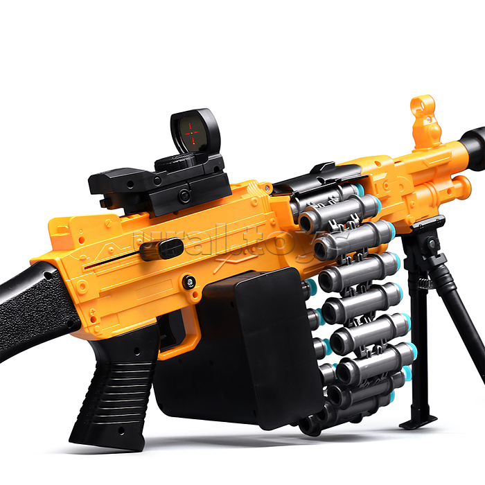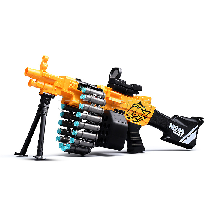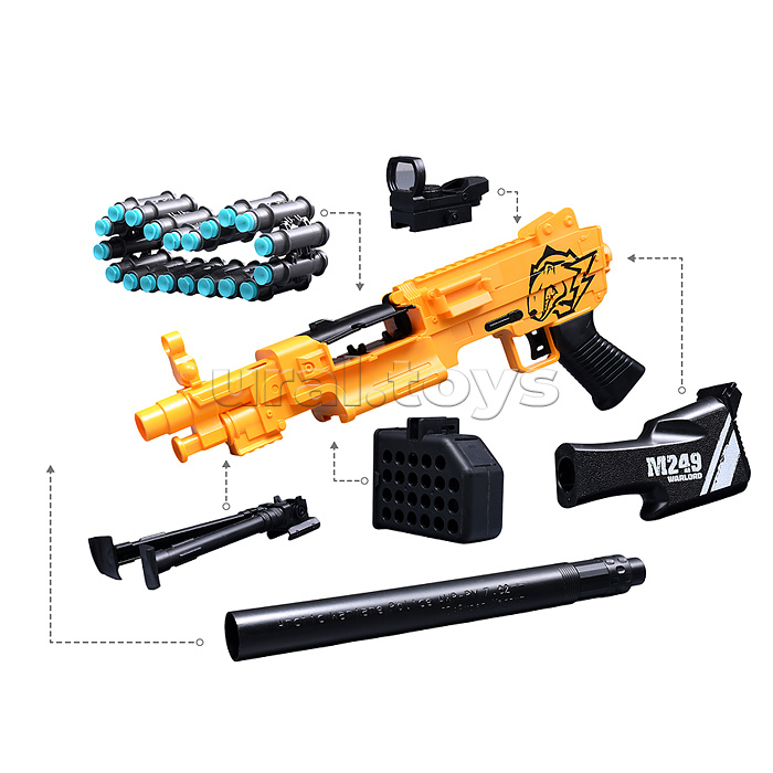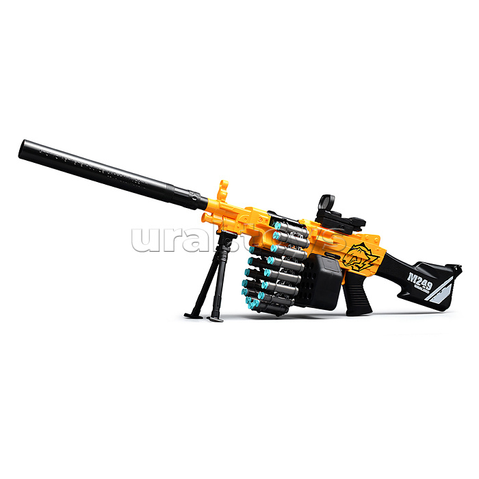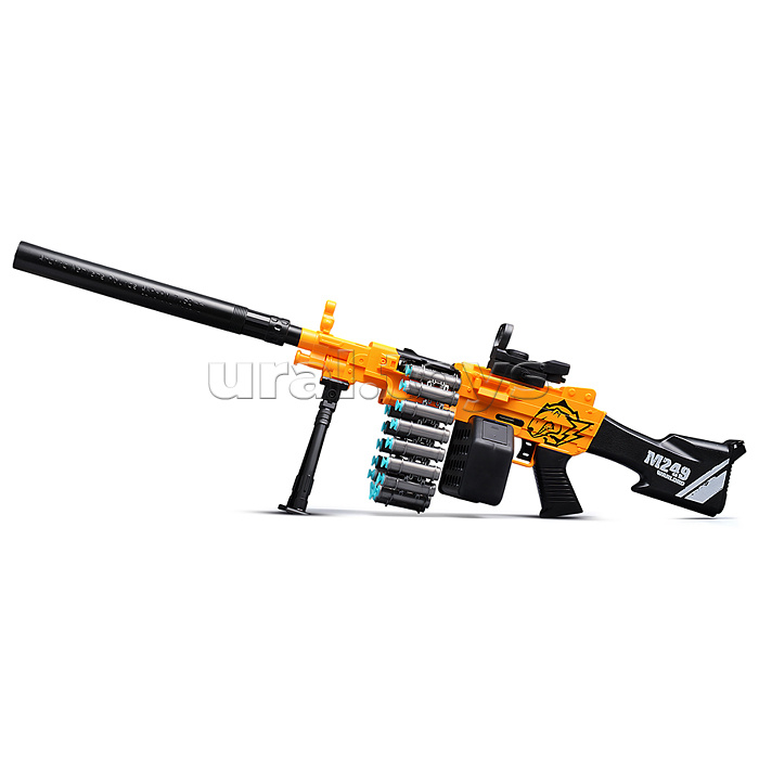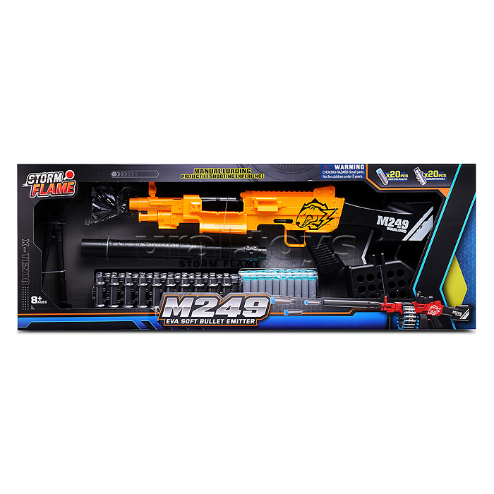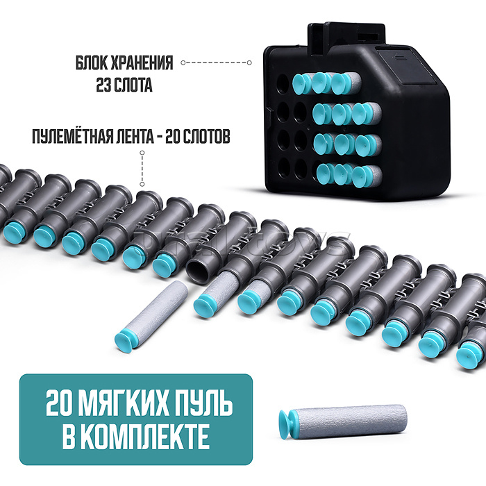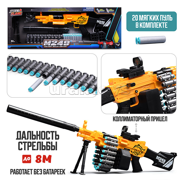 • Размеры игрушки: 86х12.5х30 см. • Пневматический механизм стрельбы. • Ручной взвод. • В комплекте: - 20 мягких пуль с присосками. - пулемётная лента. - съёмная подставка. - съёмный прицел. • Материал: пластик. • Соответствует требованиям безопасности продукции. • Для детей от 8 лет.