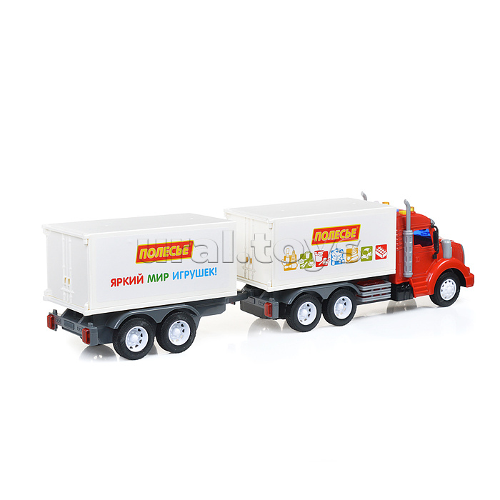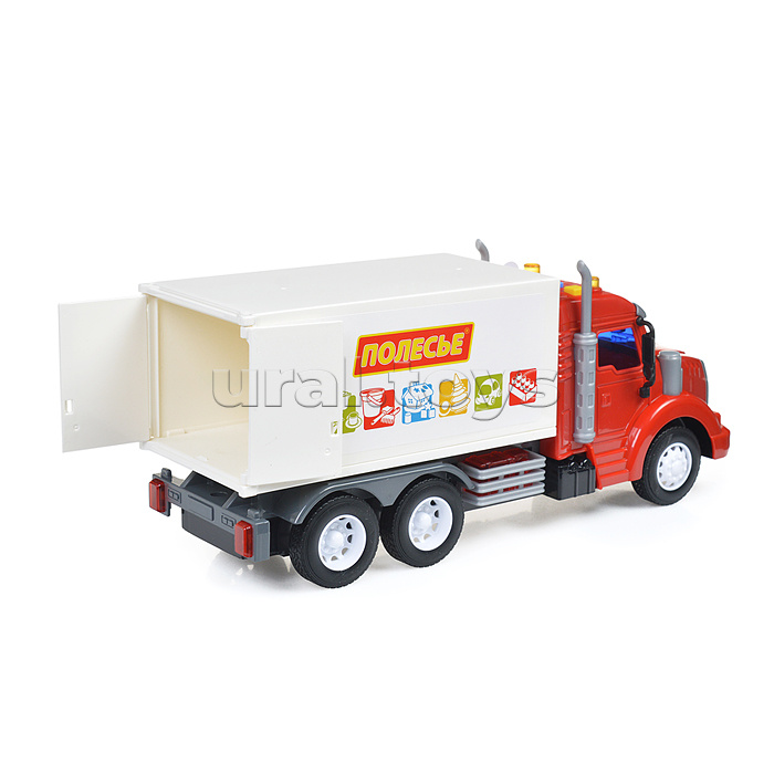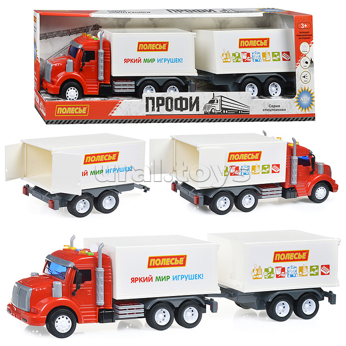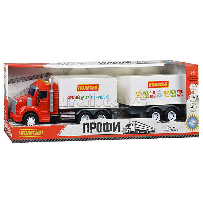Автомобиль-фургон инерционный «Профи» от фабрики «Полесье» - это качественная реалистичная игрушка, конструкция которой полностью повторяет дизайн настоящей техники. Спецмашина имеет три пары колёс на металлических осях, кроме того, она оснащена прицепом, который позволит придумывать различные сценарии игры. На кабине авто имеется 4 кнопки управления звуковыми и световыми эффектами (звуки работы двигателя, клаксона и заднего хода с подсветкой проблесковых маячков). Свет и звук работают от 3-х батареек «AG13» (в комплекте). Размеры: 51 х 9,5 х 12 см. Материалы: пластмасса, полимерные материалы. Соответствует требованиям безопасности продукции. Для детей от 3-х лет.