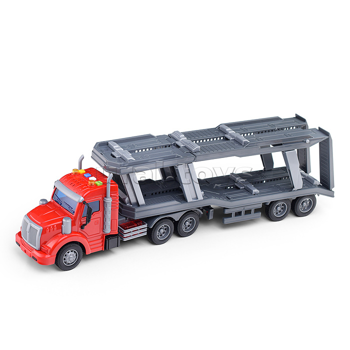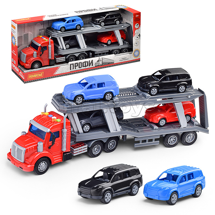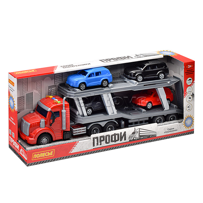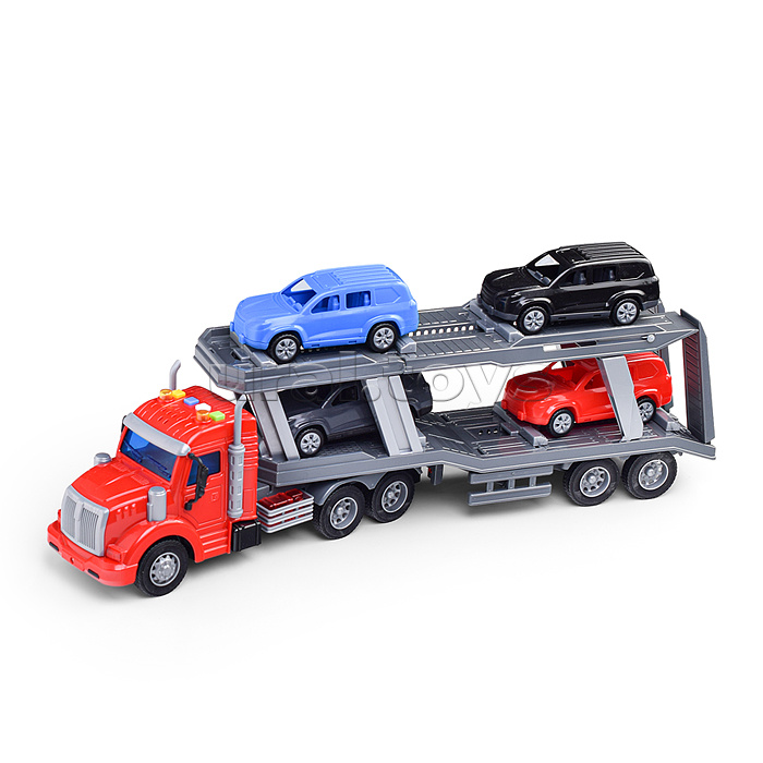 Размер: 51 х 9 х 14 см Размер машинок: 13 х 6 х 5 см Механизм тягоча: инерционный На кабине тягача расположены кнопки для управления световыми и звуковыми эффектами Трейлер работает от батареек 3 шт типа "LR44" ( в комплекте для демонстрации) Материал: пластик Для детей от 3-х лет Соответствует требованиям безопасности продукции