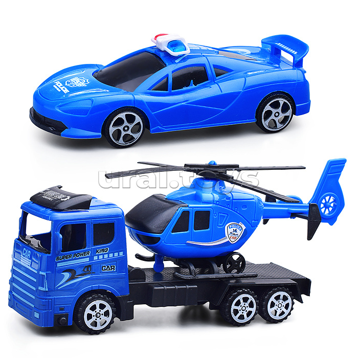• В наборе: - грузовик (18х6х7 см.) - вертолёт (14х5х6,5 см.) - машина (12,5х5х3,5 см.) • Инерционный механизм у грузовика. • Материал: пластик. • Соответствует требованиям безопасности продукции. • Для детей от 3-х лет.