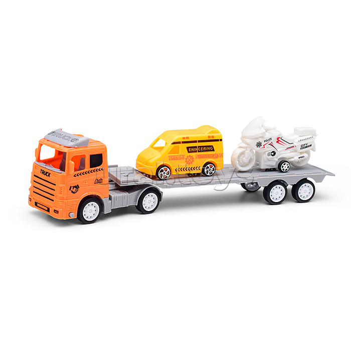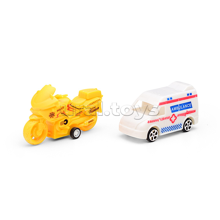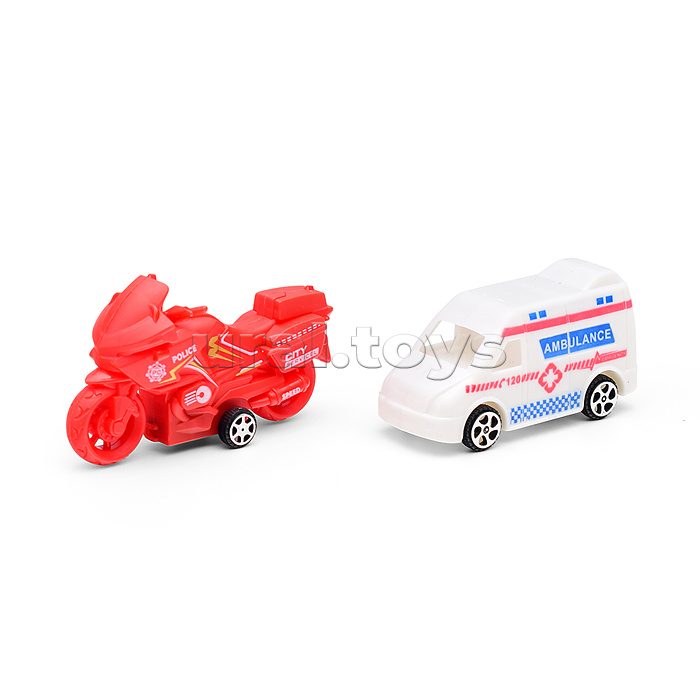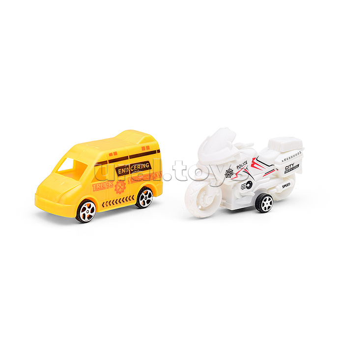 Код: 495633 Штрихкод: 6933117113148 Страна производитель: Китай Размеры упаковки: 32 x 8 x 10 см Количество в коробке: 60 • Размеры игрушки: 30х5.5х7 см. • Инерционный механизм движения. • В комплекте: - машина с инерционным механизмом (8х3.5х4 см.) - мотоцикл с инерционным механизмом (9х2.5х5.5 см.) • Материал: пластик. • Соответствует требованиям безопасности и стандартам качества продукции. • Для детей от 3-х лет. Комментарии к товару