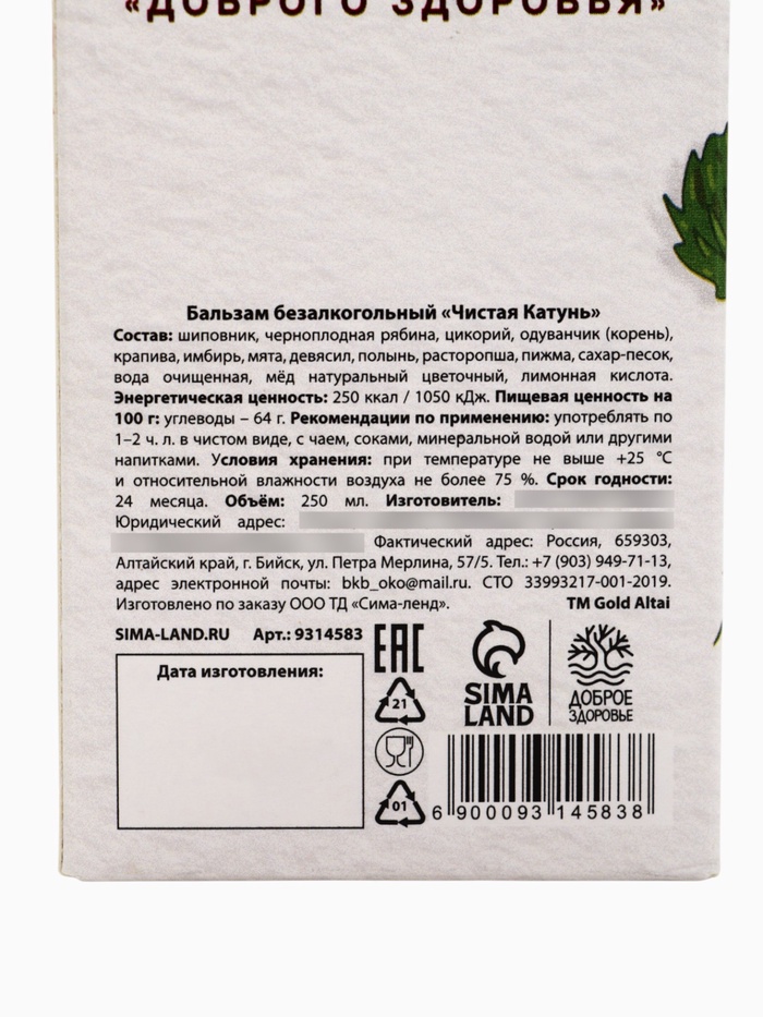Состав: шиповник, черноплодная рябина, цикорий, одуванчик (корень), крапива, имбирь, мята, девясил, полынь, расторопша, пижма, сахар-песок, вода очищенная, мёд натуральный цветочный, лимонная кислота.