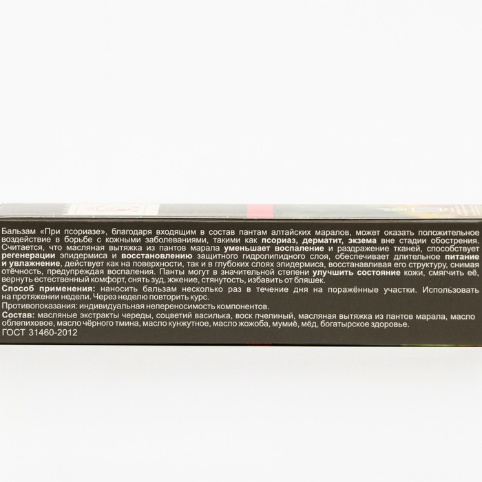 Габариты: 3,5 x 3,5 x 13,5 Страна: Россия В боксе: 80 шт Состав: См. на упаковке Материалы: см. на упаковке Фасовка: по 1 шт Индивидуальная упаковка: Картонная коробка / упаковка Сертификат: ЕАС Вес, г/Объём, мл: 30 Темпер. ограничение НЕ НИЖЕ ℃: 0 Бальзам с пантами марала «При псориазе» оказывает положительный эффект при борьбе с кожными заболеваниями, такими как псориаз, дерматиты, экземы вне обострения. Бальзам уменьшает воспаление и раздражение тканей, способствует регенерации кожи и восстановлению защитного водно-липидного слоя, обеспечивает длительное питание и увлажнение кожи. Полезные вещества действуют, как на поверхности кожи, так и в глубоких слоях эпидермиса, восстанавливая кожу, снимая отечность, останавливая воспаление и предотвращая появление новых ран, в пораженной области восстанавливается кровообращение, могут в значительной степени облегчить состояние кожи. Бальзам поможет вернуть состояние комфорта, снять зуд, жжение, стянутость, очистить кожу от бляшек, смягчить и увлажнить кожу. Состав: масляные экстракты череды, соцветий василька, воск пчелиный, масляная вытяжка из пантов марала, масло облепиховое, масло чёрного тмина, масло кунжутное, масло жожоба, мумие, мёд. Способ применения: наносить мазь несколько раз в течение дня на пораженные участки, недельным курсом. Через неделю, при надобности, повторить. Улучшения чувствуются сразу после первого применения. Комментарии к товару