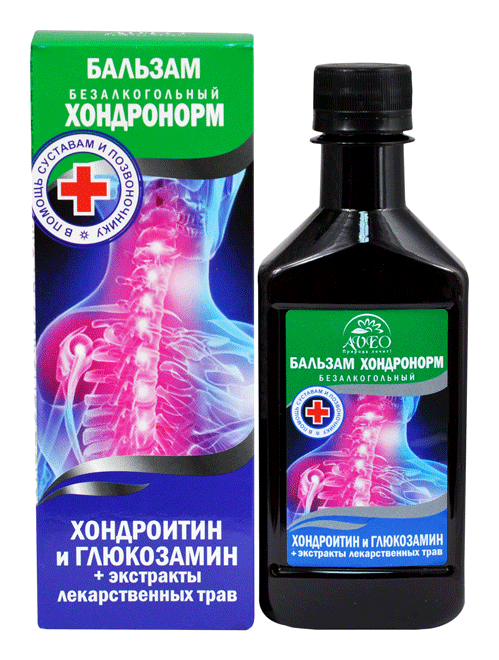 Описание товара:Бальзам безалкогольный направленного действия на основе Глюкозамина, Хондроитина и экстрактов лекарственных трав. Глюкозамин и Хондроитин - устойчивая комбинация веществ с хондропротективным действием, корректор метаболизма хрящевой ткани. Участвует в биосинтезе соединительной ткани, предотвращает процессы разрушения суставного хряща, стимулирует восстановление хрящевой ткани. При дегенеративно-дистрофических заболеваниях суставов и позвоночника уменьшает боль и воспаление, улучшает подвижность суставов и функциональное состояние опорно-двигательного аппарата. Применяется при остеоартрозах (остеоартритах), остеохондрозе позвоночника, пародонтопатиях, плечелопаточном периартрите, спондилезе, хондромаляции надколенника, подвывихах и анкилозах суставов. Применяется также при повышенной функциональной нагрузке на суставы (избыточный вес, физические нагрузки), для профилактики заболеваний суставов в пожилом возрасте, для уменьшения последствий переломов. Бальзам «ХондроНорм» содержит экстракты лекарственных трав: сабельник болотный, шиповник майский, солодка голая, ноготки, боярышник кроваво-красный, родиола розовая, ромашка аптечная, калина обыкновенная, мята перечная.Эффект индивидуален. Сабельник болотный (корень) уменьшают боль и воспаление при отложении солей, подагре, радикулите, ревматизме. Восстанавливает костно-суставную систему, нормализует водно-солевой обмен в организме. Плоды шиповника повышают устойчивость и защитные реакции организма, активизируют основной обмен веществ, обеспечивают прочность и износостойкость суставов. Корень солодки оказывает спазмолитическое, противовоспалительное, противоопухолевое, ранозаживляющее действие. Усиливает основное действие лекарственных трав и плодов сбора. Цветки ноготков в составе бальзама оказывают противовоспалительное, дезинфицирующее, антисептическое, ранозаживляющее действие. Плоды боярышника снижают содержание холестерина в крови, расширяют периферические сосуды и сосуды внутренних органов. Корневище родиолы розовой (золотой корень) усиливает сопротивляемость организма неблагоприятным воздействиям, способствует выведению радионуклидов и токсичных элементов, обладает противоопухолевой активностью. Ромашка аптечная применяется как спазмолитическое, антисептическое, седативное и обезболивающее средство. Плоды калины обыкновенной в составе бальзама оказывают седативное и спазмолитическое действие. Применяются как поливитаминное, общеукрепляющее средство. Листья мяты перечной обладают антисептическими, успокаивающими и общеукрепляющими свойствами, придает бальзаму неповторимый аромат и вкус. Глюкозамин и Хондроитин комбинация активных веществ с хондропротективным действием. Предотвращает процессы разрушения суставного хряща, стимулирует восстановление хрящевой ткани. Состав:водный экстракт из смеси растительного сырья (корневищ с корнями сабельника болотного, плодов шиповника майского, корней солодки голой, цветков ноготков, плодов боярышника кроваво- красного, корневищ с корнями родиолы розовой, цветков ромашки аптечной, плодов калины обыкновенной, листьев мяты перечной), глюкозамина сульфат, хондроитинсульфат. Вспомогательные компоненты: сахар, регулятор кислотности — лимонная кислота (Е330),