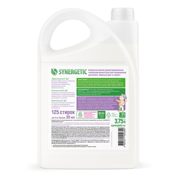 Биоразлагаемый концентрированный гипоаллергенный бальзам-кондиционер для белья SYNERGETIC с нежным ароматом "Нежный ирис и гранат" на основе масла хлопка придает белью мягкость и способствует его быстрому высыханию после стирки. Средство нейтрализует остатки средств для стирки на ткани, помогает сохранить структуру ткани, защищая волокна от изнашивания и повреждения.