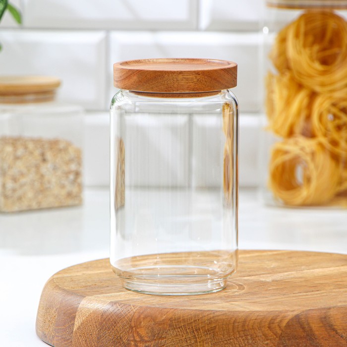 Стеклянная банка премиального качества для хранения круп, специй, сыпучих и других пищевых продуктов. Банка стеклянная с крышкой прекрасный вариант хранения на кухне. Крышка из дерева позволяет плотно закрывать банку и препятствует проникновению влаги и посторонних запахов.