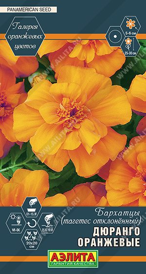 Порция хорошего настроения с оранжевыми цветами! В настоящее время модно создавать цветники, где присутствуют эффектные цветы одной окраски, например, ярко-оранжевые. Они наполняют клумбы праздничной атмосферой и создают контрастные композиции с другими растениями. Считается, если вам нравится оранжевый цвет, вас обязательно ждет успех! Необыкновенные ярко-оранжевые бархатцы американской селекции от компании Pan American seed! Пушистые аккуратные кусты, высотой 25- 30 см, отлично ветвятся, образуя множество махровых соцветий, ? 5-6 см. Бархатцы Дюранго созданы для разнообразных цветочных композиций, садовых вазонов и контейнеров. Фасовка 10шт Комментарии к товару
