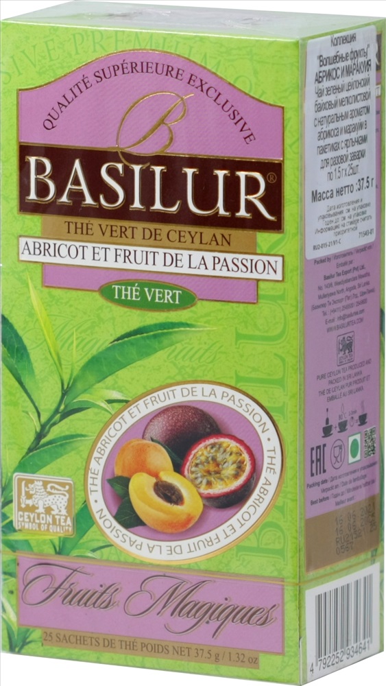 Чай зеленый цейлонский байховый мелколистовой с натуральными ароматами абрикоса и маракуйи в пакетиках с ярлычками для разовой заварки.Изготовлено и упаковано на Шри-Ланке.