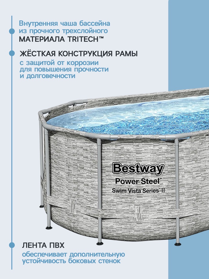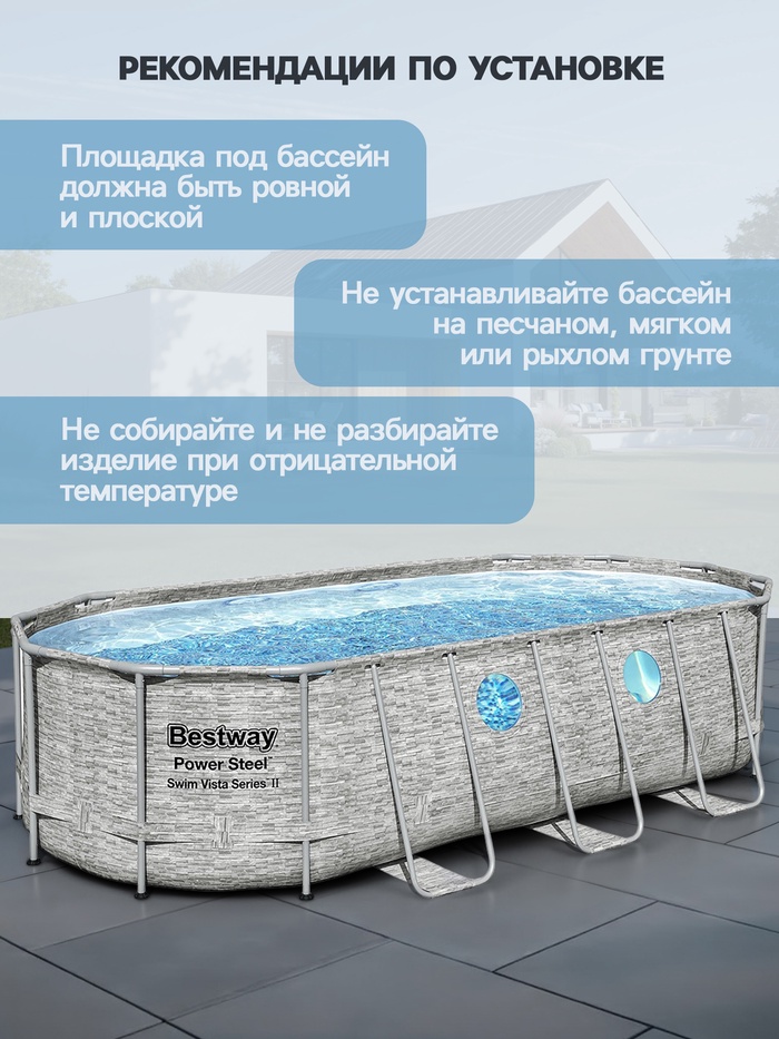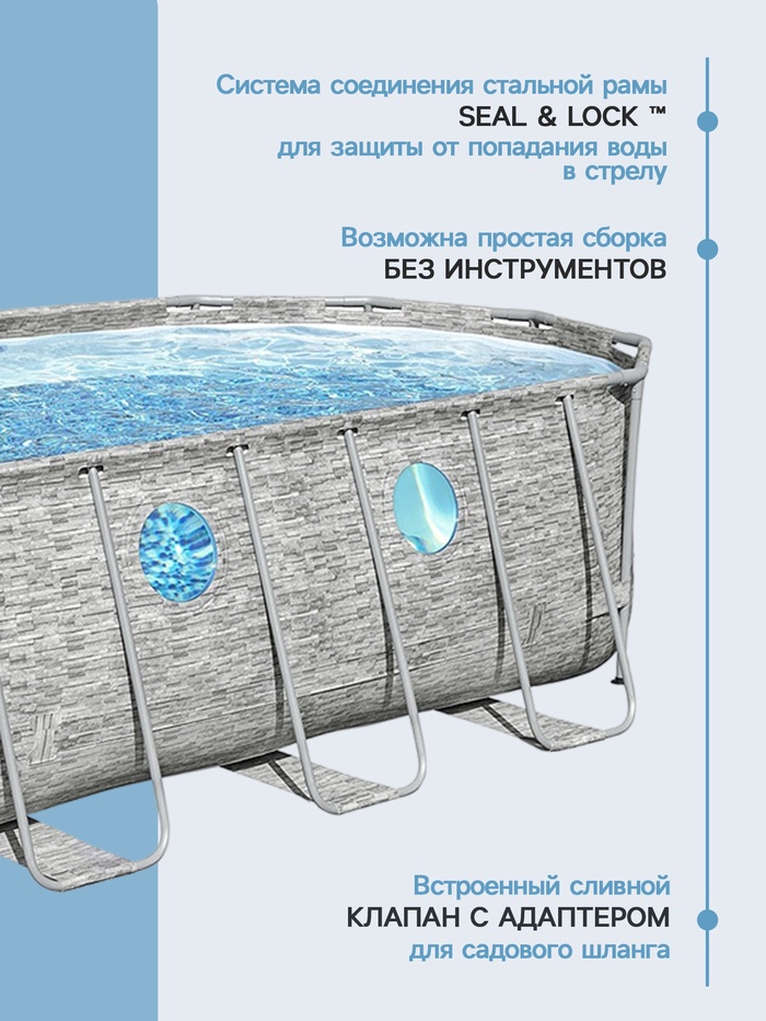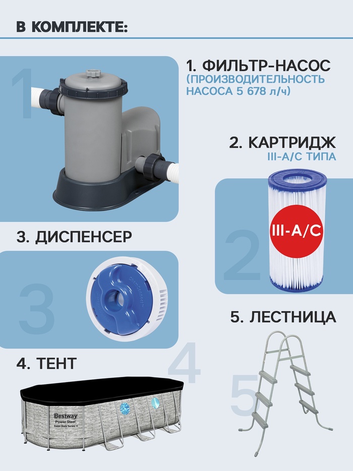 Габариты: 62,5 x 54,5 x 145 Доставка: Платная Артикул поставщика: 56716 Страна: Китай В боксе: 1 шт Состав: Металл, ПВХ, пластик Материалы: металл, ПВХ, пластик Фасовка: по 1 шт Индивидуальная упаковка: Картонная коробка / упаковка Сертификат: Не подлежит сертификации Цвет: Серый Форма: Овальная Длина, см: 549 Ширина, см: 274 Высота, см: 122 Тип фильтра для насоса: Фильтр-картридж Количество слоёв: 3 Вес нетто, кг: 82,77 Производительность, л/ч: 5678 Объём, л: 13430 Тент: Да Подстилка: Нет Лестница: Да Темпер. ограничение НЕ НИЖЕ ℃: 0 Диспенсер: Да Наличие фильтр-насоса: Да Каркасный бассейн — это отличный выбор для всей семьи. Каркас бассейна сделан из прочного металла, что позволяет выдерживать большие нагрузки. Материал бассейна выдерживает суровые погодные условия, устойчив к прямым попаданиям солнечных лучей и воздействию хлора, выдерживает давление больших объёмов воды. Встроенный сливной клапан облегчает слив воды, путём присоединения садового шланга с входящим в комплект адаптером. Таким образом, воду можно слить в любое удобное место или, например, полить сад. В комплекте с бассейном прилагается фильтр-насос. Тип картриджей для фильтр-насоса: «III A/C». Комментарии к товару