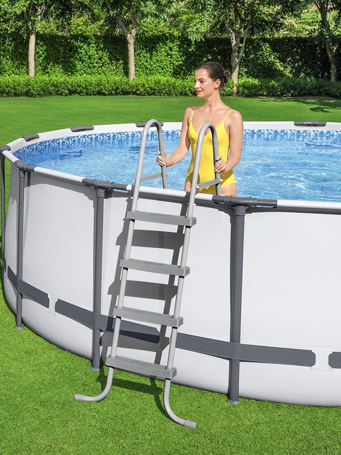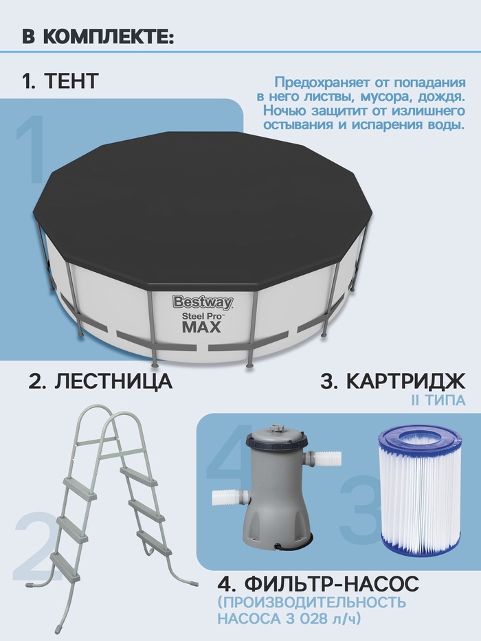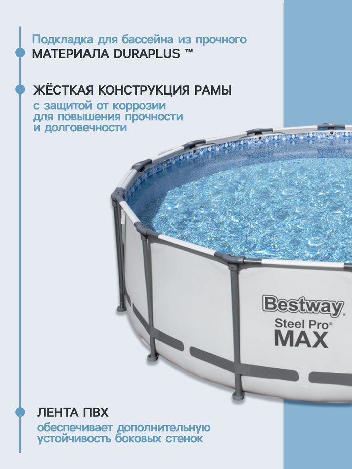 Габариты: 39 x 54 x 124 Доставка: Платная Артикул поставщика: 5612X Страна: Китай В боксе: 1 шт Состав: Металл, ПВХ, пластик Материалы: металл, ПВХ, пластик Фасовка: по 1 шт Индивидуальная упаковка: Картонная коробка / упаковка Сертификат: Не подлежит сертификации Цвет: Серый Форма: Круглая Диаметр, см: 427 Длина, см: 427 Ширина, см: 427 Высота, см: 122 Тип фильтра для насоса: Фильтр-картридж Количество слоёв: 3 Производительность, л/ч: 3028 Объём, л: 15232 Тент: Да Подстилка: Нет Лестница: Да Темпер. ограничение НЕ НИЖЕ ℃: 0 Наличие фильтр-насоса: Да Фиксированная цена: Да Бассейн быстро устанавливается благодаря простой системе сборки труб. Никаких дополнительных инструментов не требуется. Металлическая трубчатая конструкция удерживает давление воды в бассейне, сохраняя его устойчивость и стабильность во время использования. Бассейн необходимо установить на ровную поверхность, удалив предметы, которые могут повредить дно. Благодаря материалу Duraplus™ лайнер устойчив к проколам. Два слоя 3-слойного армированного ПВХ с полиэстеровой сеткой в центре повышают долговечность, устойчивость к ультрафиолетовым лучам. Высокая прочность материала и соединение швов выдерживают большие нагрузки. Технология Framelink System™ обеспечивает противокоррозионное действие между соединениями. Это уменьшает образование ржавчины. В комплекте к бассейну входят: фильтр-насос с картриджем, лестница, тент. Конструкция