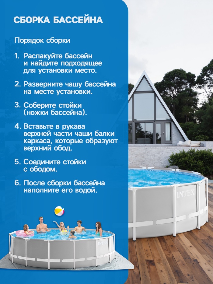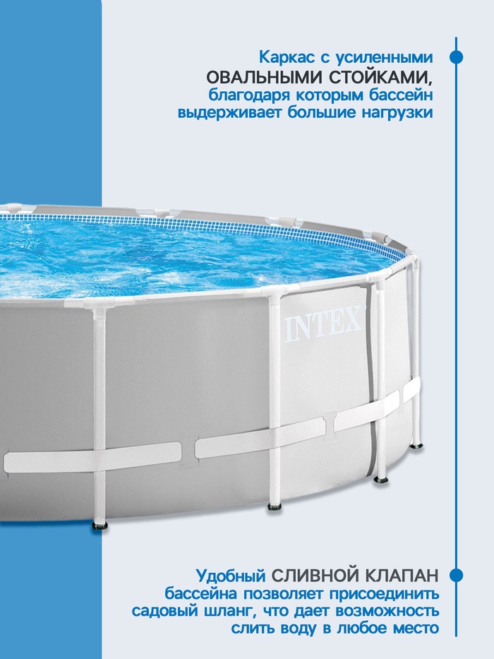 Габариты: 69,9 x 39,7 x 129,2 Артикул поставщика: 26726NP Страна: Китай В боксе: 1 шт Состав: Металл, ПВХ, пластик Материалы: металл, ПВХ, пластик Фасовка: по 1 шт Индивидуальная упаковка: Цветная коробка Сертификат: Не подлежит сертификации Цвет: Серый Форма: Круглая Диаметр, см: 457 Высота, см: 122 Тип фильтра для насоса: Фильтр-картридж Количество слоёв: 3 Производительность, л/ч: 3785 Объём, л: 16805 Тент: Да Подстилка: Да Лестница: Да Темпер. ограничение НЕ НИЖЕ ℃: 0 Диспенсер: Нет Наличие фильтр-насоса: Да Фиксированная цена: Да Каркасный бассейн — это отличный выбор для всей семьи. Каркас бассейна сделан из прочного металла, что позволяет выдерживать ему большие нагрузки. Материал бассейна выдерживает суровые погодные условия, устойчив к прямым попаданиям солнечных лучей и воздействию хлора, выдерживает давление больших объёмов воды. Встроенный сливной клапан облегчает слив воды, путём присоединения садового шланга с входящим в комплект адаптером. Таким образом, воду можно слить в любое удобное место или, например, полить сад. В комплекте с бассейном прилагается фильтр-насос. Тип картриджей для фильтр-насоса: «A». ДополнительноСборные каркасные бассейны Intex Prism Frame Pool с простой, стабильной и надёжной конструкцией. Улучшенная конструкция каркаса и цвет чаши - основные отличия от бассейнов серии Metal Frame. Стойки каркаса имеют овальное сечение, что увеличивает надёжность конструкции. Особый метод порошкового напыления защищает металлические детали каркаса от окислений и ржавчины. Технология Super-Touch (сочетание винила и полиэстера), используемая в производстве, наделяет материал тройной прочностью, стойкостью к ударам, воздействию солнечного света, растягиваниям и стираниям. Комментарии к товару