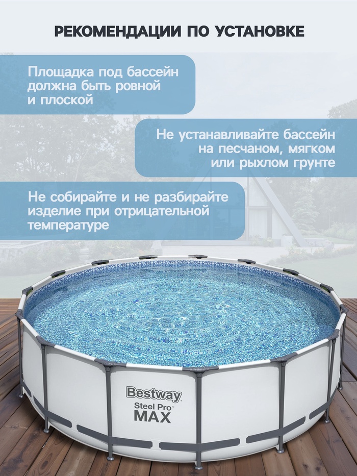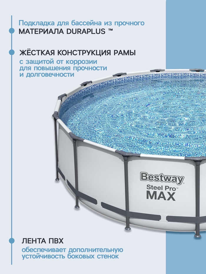 Габариты: 123 x 57 x 39 Доставка: Платная Артикул поставщика: 56438 Страна: Китай В боксе: 1 шт Состав: Металл, ПВХ, пластик Материалы: металл, ПВХ, пластик Фасовка: по 1 шт Индивидуальная упаковка: Пакет (БОПП, полиэтилен, ПВХ, дой-пак) Сертификат: Не подлежит сертификации Цвет: Серый Форма: Круглая Диаметр, см: 457 Длина, см: 457 Ширина, см: 457 Высота, см: 122 Тип фильтра для насоса: Фильтр-картридж Количество слоёв: 3 Вес нетто, кг: 54,85 Производительность, л/ч: 3028 Объём, л: 16015 Тент: Да Подстилка: Нет Лестница: Да Темпер. ограничение НЕ НИЖЕ ℃: 0 Диспенсер: Нет Наличие фильтр-насоса: Да Фиксированная цена: Да Бассейн быстро устанавливается благодаря простой системе сборки труб. Никаких дополнительных инструментов не требуется. Металлическая трубчатая конструкция удерживает давление воды в бассейне, сохраняя его устойчивость и стабильность во время использования. Бассейн необходимо установить на ровную поверхность, удалив предметы, которые могут повредить дно. Благодаря материалу Duraplus™ лайнер устойчив к проколам. Два слоя 3-слойного армированного ПВХ с полиэстеровой сеткой в центре повышают долговечность, устойчивость к ультрафиолетовым лучам. Высокая прочность материала и соединение швов выдерживают большие нагрузки. Технология Framelink System™ обеспечивает противокоррозионное действие между соединениями. Это уменьшает образование ржавчины. В комплекте к бассейну входят: фильтр-насос с картриджем, лестница, тент. Конструкция