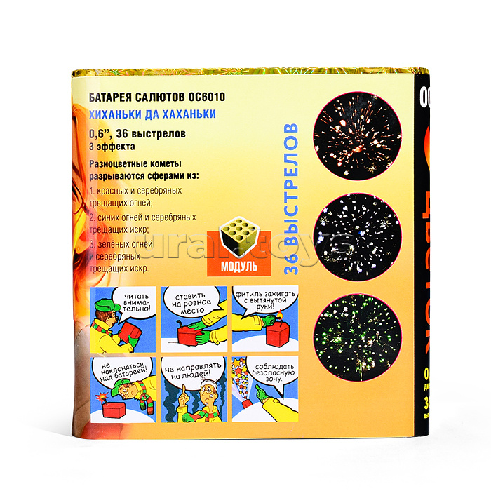 Код: 461944 Страна производитель: Китай Размеры упаковки: 16.1 x 15 x 15.7 см Количество в коробке: 18 • Количество залпов: 36. • Калибр: 0.6 дюйма. • Разноцветные кометы разрываются сферами из: - Красных и серебряных трещащих огней. - Синих огней и серебряных трещащих искр. - Зелёных огней и серебряных трещащих искр. • Залп выстреливает на высоту до 20 метров. • Время действия салюта: 20 сек. • Соответствует требованиям безопасности и стандартам качества продукции. Комментарии к товару