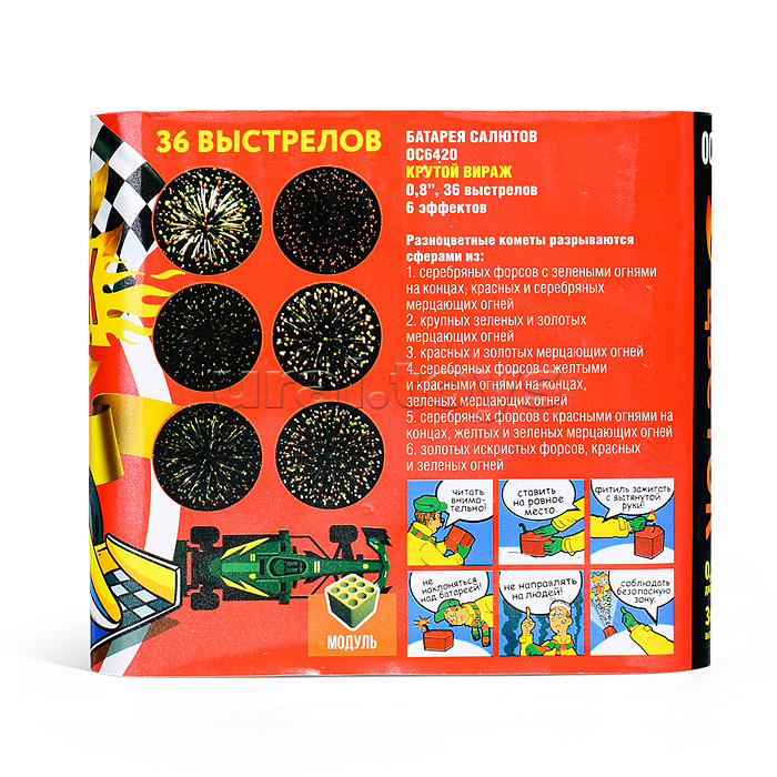 Код: 270319 Страна производитель: Китай Размеры упаковки: 17.6 x 14.2 x 12.8 см Количество в коробке: 12 • Количество залпов: 36. • Калибр: 0.8 дюйма. • Эффекты: - разноцветные кометы разрываются сферами. - серебряные форсы с зелеными огнями на концах, красные и серебряные мерцающие огни. - крупные зеленые и золотые мерцающие огни. - красные и золотые мерцающие огни. - серебряные форсы с желтыми и красными огнями на концах, зеленые мерцающие огни. - серебряные форсы с красными огнями на концах, желтые и зеленые мерцающие огни. - золотые искристые форсы, красные и зеленые огни. • Залп выстреливает на высоту до 30 метров. • Время действия салюта: 40 сек. • Соответствует требованиям безопасности и стандартам качества продукции. Комментарии к товару
