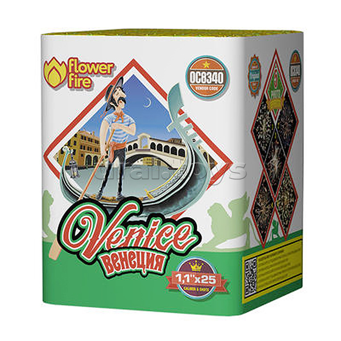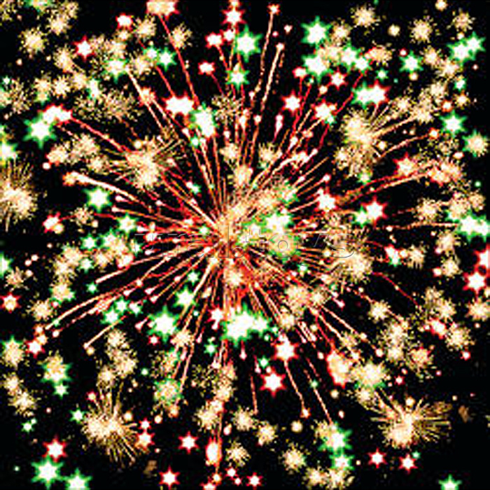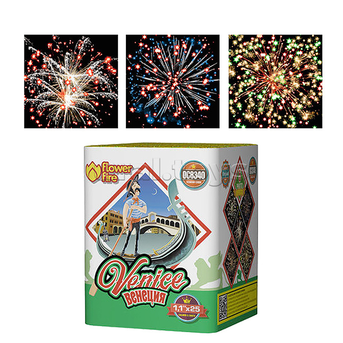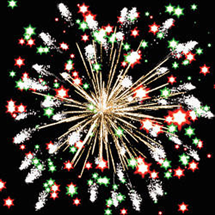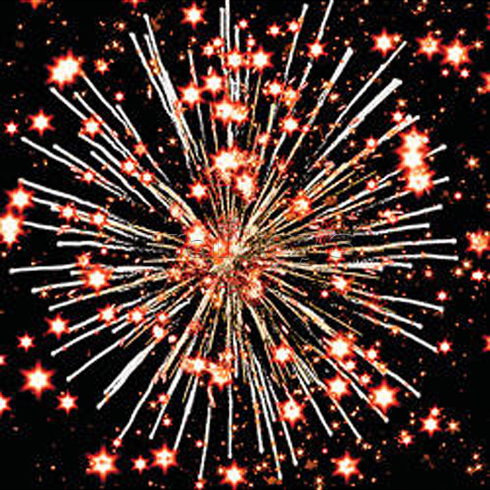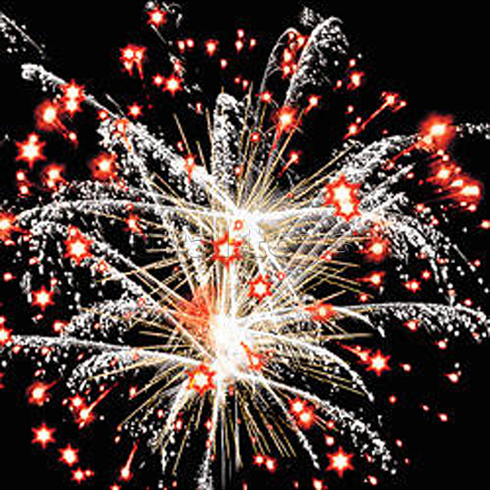 Батарея салютов 25 залпов Имеет 5 эффектов: Разноцветные кометы разрываются сферами из: 1-2.серебряных форсов с трещащих зеленых ,золотых огней 3.серебряных форсов, синих и красных мерцающих огней 4.серебряных искристых форсов и красных мерцающих огней 5.красных и зеленых огней, множеством трещащих сфер
