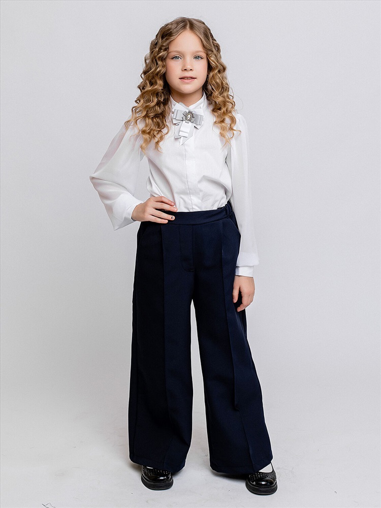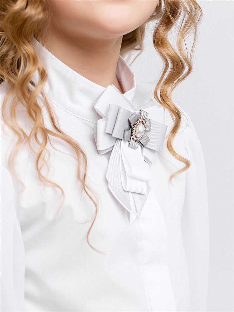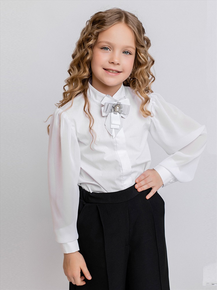 Блузка для девочки школьная белая со съемным бантом на булавке. Прозрачные длинные рукава из шифона. Красивая нарядная блузка из сорочечной ткани с добавлением шифона отличается высоким качество материала и комфортом в носке.