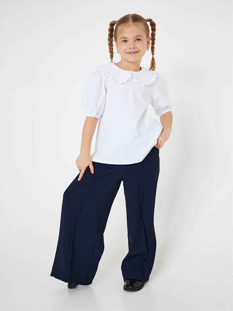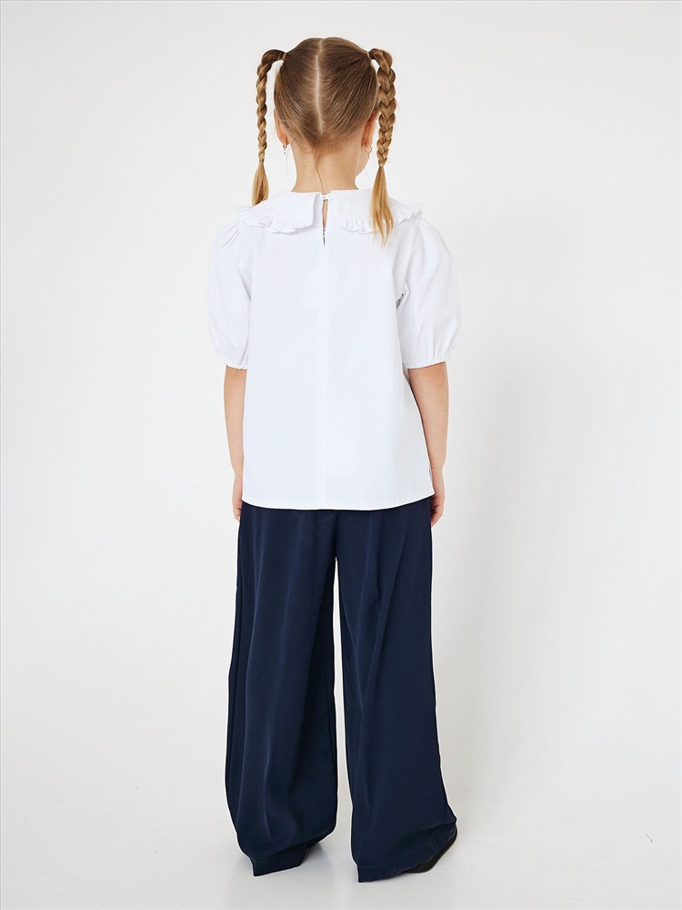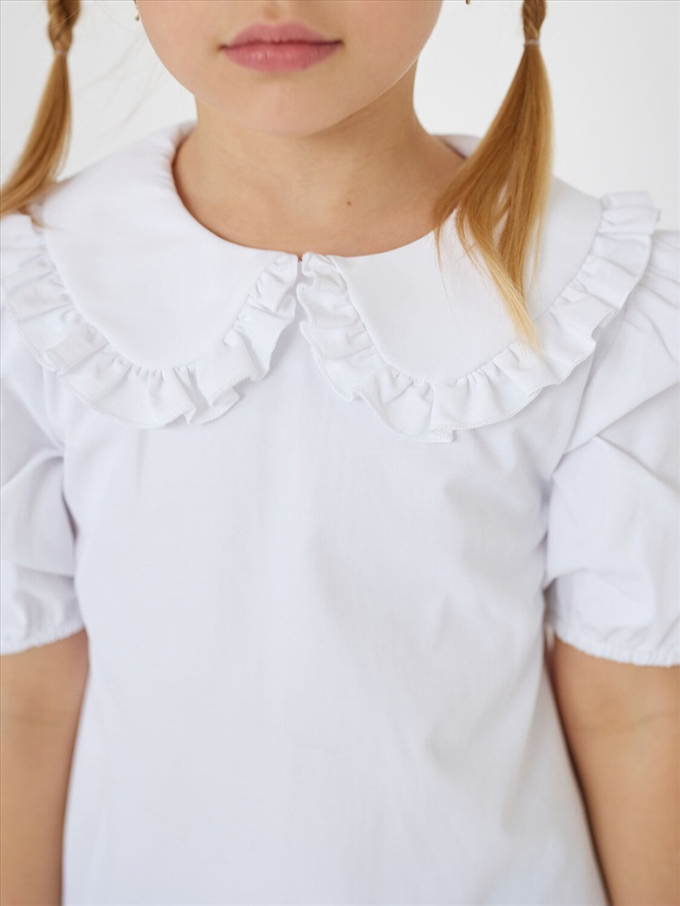Блузка для девочки белая с короткими рукавами на резинке и декоративным воротником. Застежка на петли пуговицы. Красивая школьная блузка с украшением на воротнике подойдет на каждый день и как праздничный вариант.