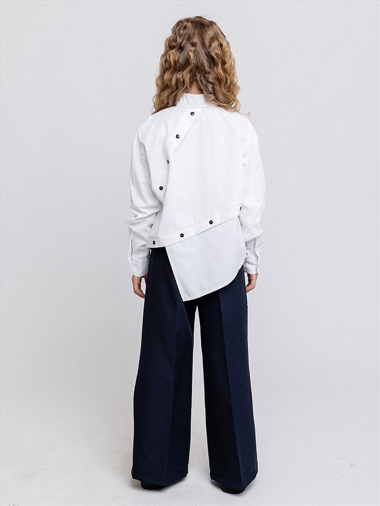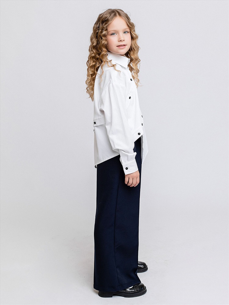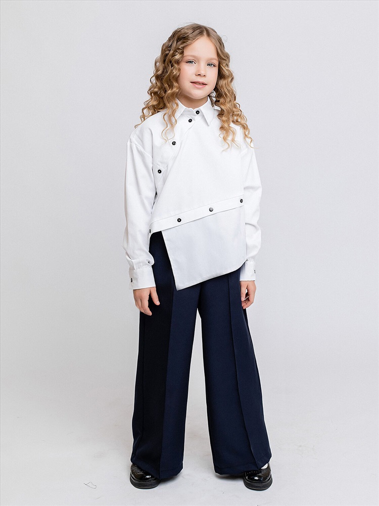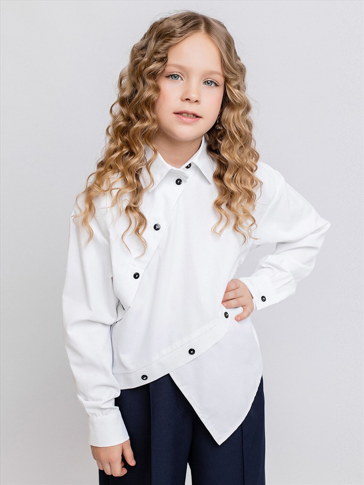 Блузка для девочки белая оверсайз с длинными рукавами. Ассиметричная застежка на пуговки. Элегантная блузка для школы выполнена из сорочечной ткани, смотрится стильно и оригинально.