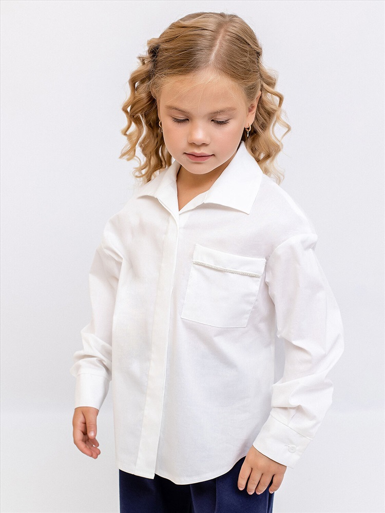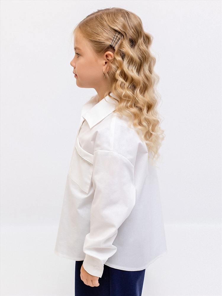 Хлопковая белая базовая блузка идеально подходит для школы, отличается легкостью и комфортом. Модель свободного кроя с отложным воротником и манжетами на рукавах. Спереди один карман с отделкой стразами, а сзади блуза имеет удлиненный крой. Ткань гигроскопичная и легкая, выполнена из натурального эластичного хлопка.