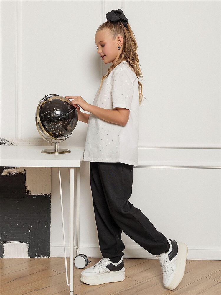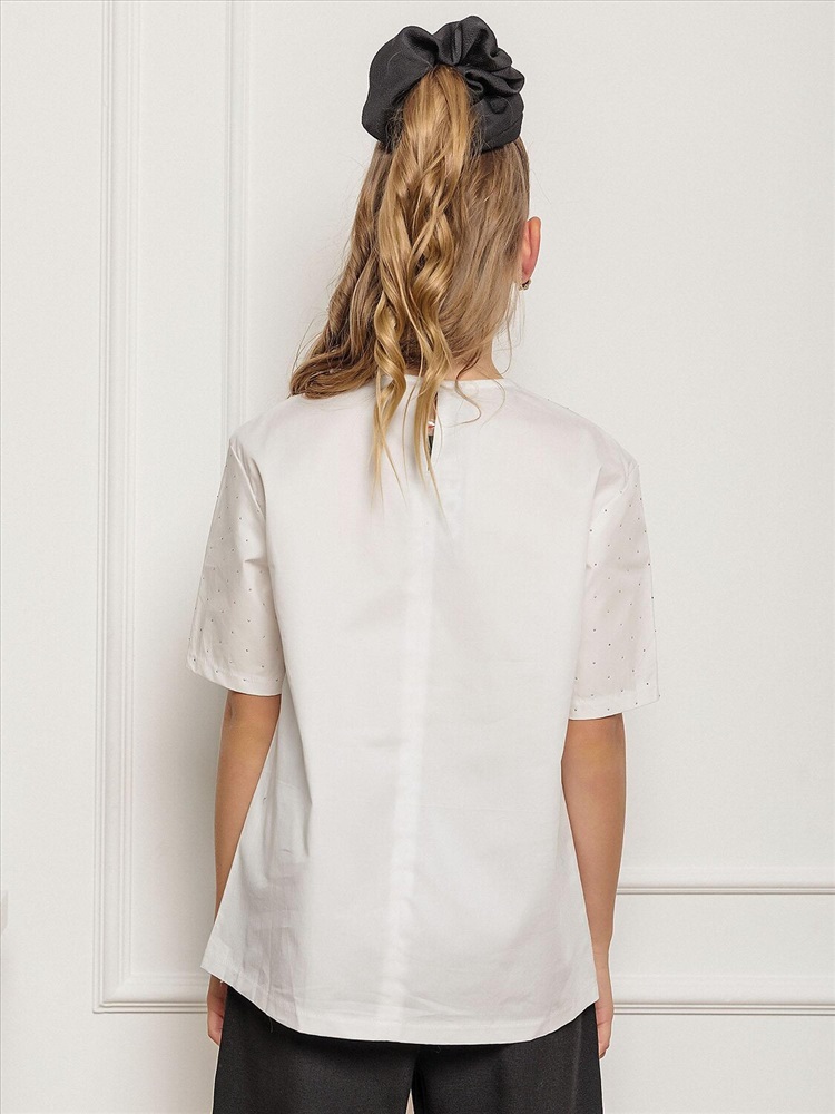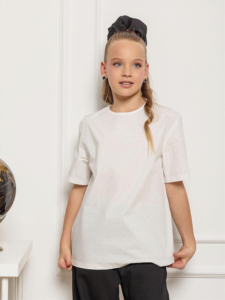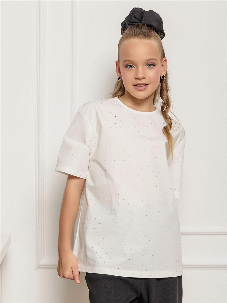 Белая блузка для девочки с элегантными деталями. Спущенное плечо – модный дизайн, который добавляет образу легкость. Короткий рукав – идеальный вариант для теплого сезона. Застежка на пуговицу сзади. Классический белый цвет – универсальный оттенок, который сочетается с любой юбкой, брюками или шортами. Удобный крой – не сковывает движения, обеспечивая комфорт в течение всего дня. Качественный материал – приятный к телу, хорошо держит форму. Стильный фасон – подходит как для школы, так и для праздничных мероприятий.