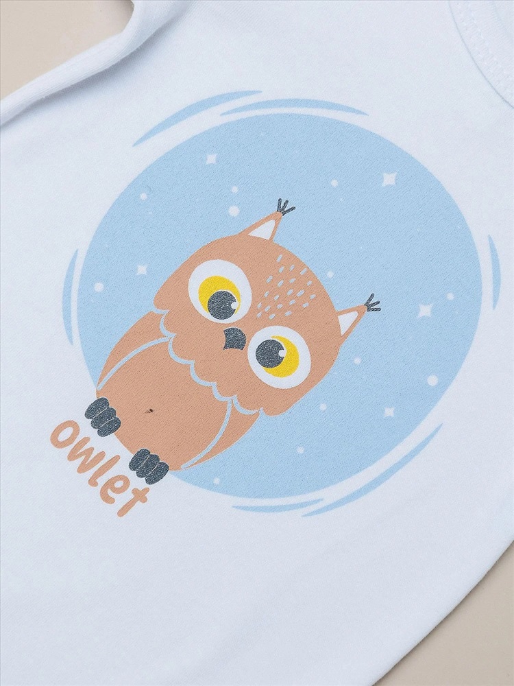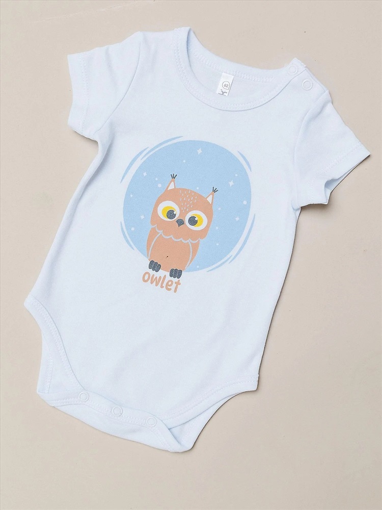 Боди с коротким рукавом для мальчика белый в с рисунком в виде совы. Идеальный выбор для новорожденных. Летнее хлопковое изделие создано с учетом всех потребностей малышей. Горловина и зона подгузника на кнопках.