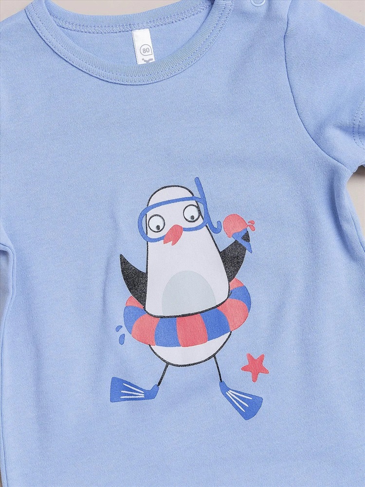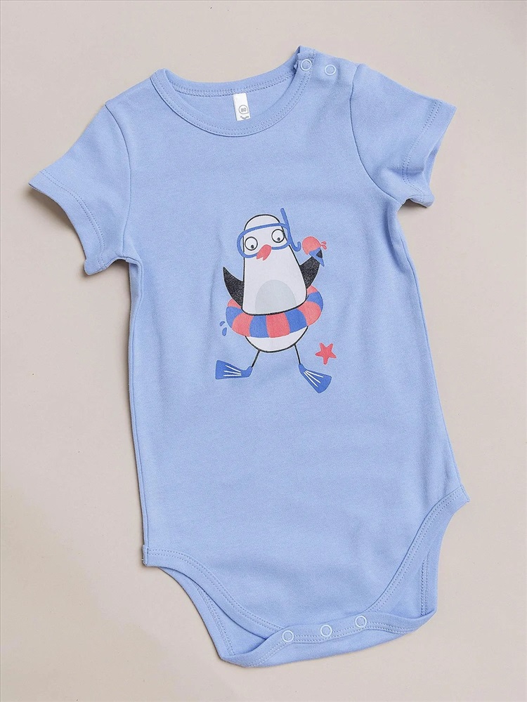 Боди с коротким рукавом для мальчика голубое из интерлока. Ровные швы, качественная фурнитура, мягкая ткань. Горловина и низ на кнопках. На груди принт в виде забавного пингвина.