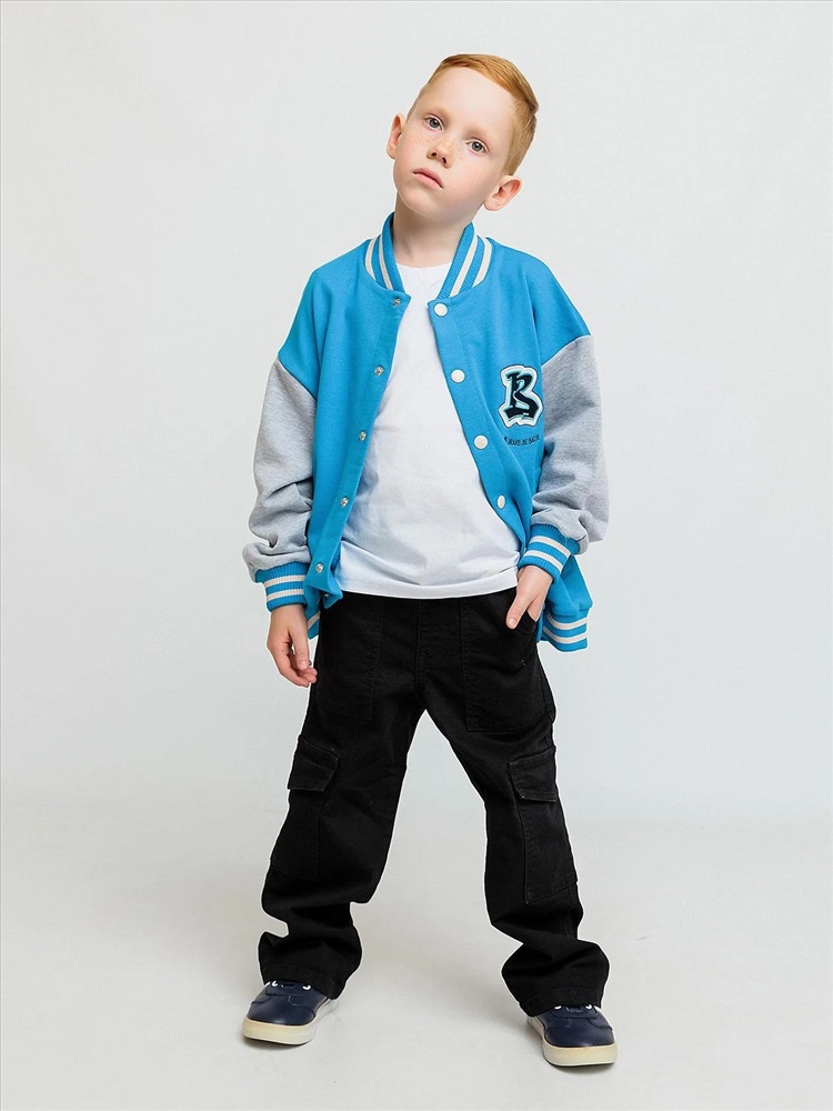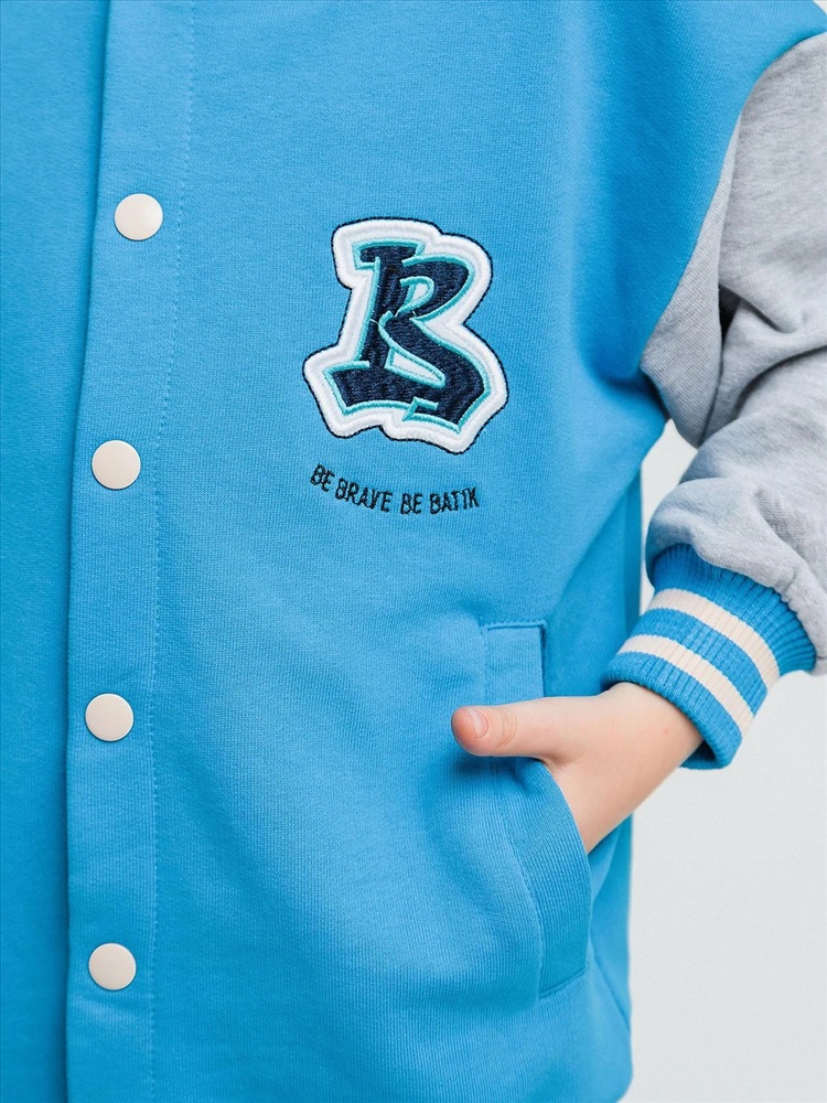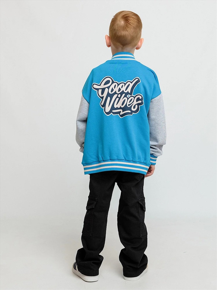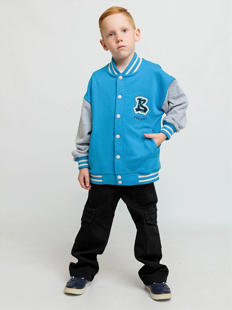 Бомбер для мальчика из футера серо-голубой на кнопках. Бомбер детский с карманами из качественного хлопкового материала, который не вызывает аллергии и не требует специального ухода. Воротничок, манжеты рукавов и низ изделия на мягкой трикотажной резинке.